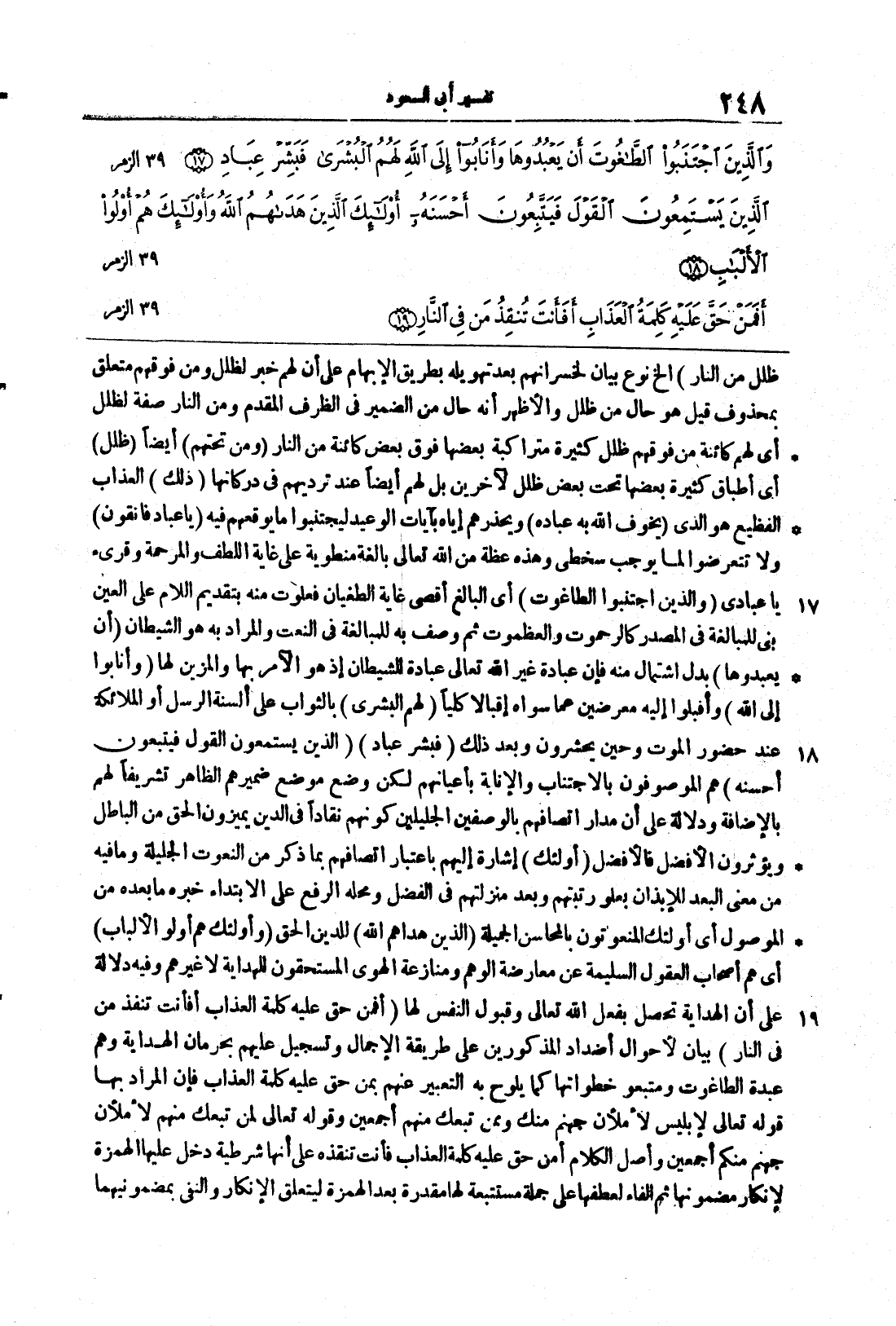 {أَفَمَنْ حَقَّ عَلَيْهِ كَلِمَةُ العذاب أَفَأَنتَ تُنقِذُ مَن في النار} بيان الاحوال أضَّدادِ المذكورينَ على طريقة الإجمالِ وتسجيلٌ عليهم بحرمانِ الهداية وهم عَبَدةُ الطَّاغوتَ ومتَّبعُو خطواتها كما يُلوحُ به التَّعبيرُ عنهم بمن حق عليه كلمة العذاب فإنَّ المرادَ بها قولُه تعالى لإبليسَ لاَمْلاَنَّ جَهَنَّمَ مِنكَ وَمِمَّن تَبِعَكَ منهم أجمعين وقوله تعالى لمن تبعك منهم لامْلانَّ جَهَنَّمَ مِنكُمْ أَجْمَعِينَ وأصلُ الكلامِ أمن حقَّ عليه كلمةُ العذاب فأنتَ تنقذه على أنَّها شرطيةٌ دخل عليها الهمزةُ لإنكارِ مضمونها ثم الفاءُ لعطفها على جملةٍ مستتبعة لها مقدَّرة بعد الهمزةِ ليتعلَّق الإنكارُ والنَّفيُ بمضمونيهما