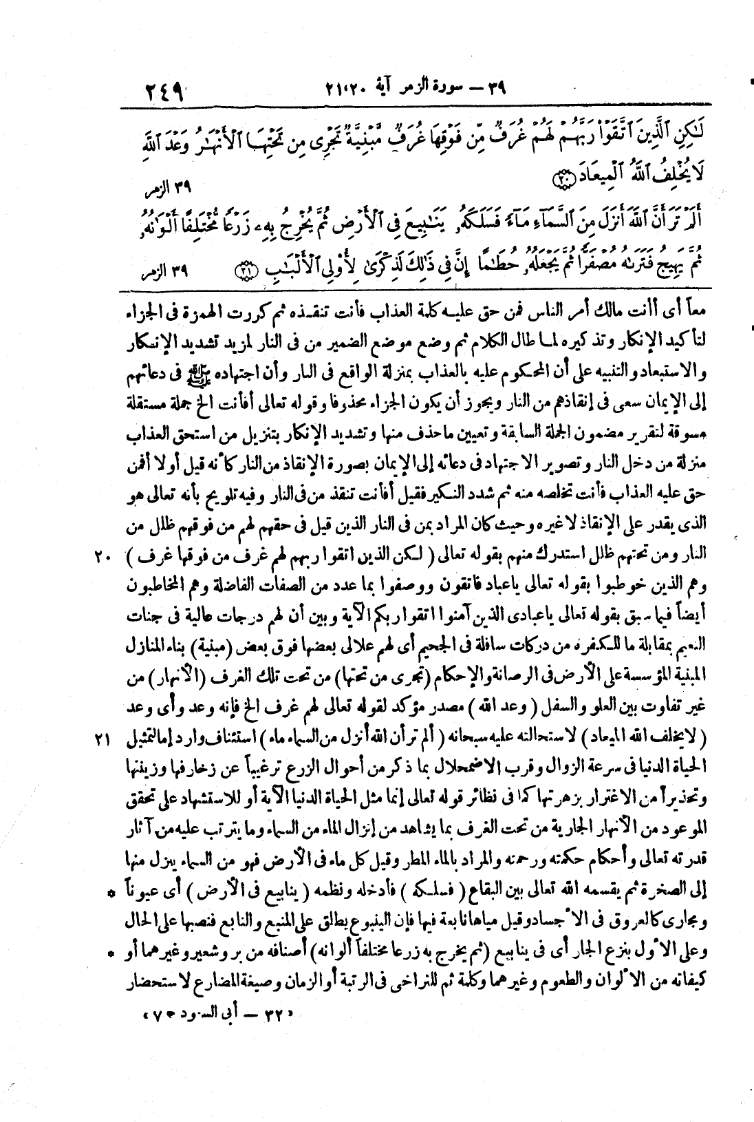 الزمر 20 21 معاً أي أأنتَ مالكُ أمرِ النَّاسِ فمن حقَّ عليه كلمة العذاب فأنت تنقذه ثم كُررتْ الهمزةُ في الجزاءِ لتأكيدِ الإنكارِ وتذكيرِه لمَّا طال الكلامُ ثم وضِع موضعَ الضَّميرِ مَن في النَّارِ لمزيد تشديدِ الإنكارِ والاستبعاد والتَّنبيه عَلى أنَّ المحكومَ عليهِ بالعذابِ بمنزلة الواقعِ في النار وان اجتهاده صلى الله عليه وسلم فى دُعائهم إلى الإيمانِ سعيٌ في إنقاذِهم من النَّارِ ويجوزُ أن يكونَ الجزاءُ محذوفاً وقوله تعالى أفأنتَ الخ جملة مستقلَّةٌ مسوقة لتقريرِ مضمون الجملة السَّابقةِ وتعيين ما حُذف منها وتشديدِ الإنكارِ بتنزيل من استحقَّ العذابَ منزلةَ من دخل النَّارَ وتصوير الاجتهاد في دُعائه إلى الإيمان بصورةِ الإنقاذِ من النَّارِ كأنَّه قيل أوَّلاً أفمن حقَّ عليه العذابُ فأنتَ تخلِّصه منه ثم شُدِّد النَّكيرُ فقيل أفأنتَ تنقذ من فى النار وفيه تلويحٌ بأنَّه تعالى هو الذي يقدر على الانقاذ لا غيرُه وحيثُ كان المرادُ بمن في النَّارِ الذين قيل في حقِّهم لَهُمْ مّن فَوْقِهِمْ ظُلَلٌ من النار ومن تحتهم ظُلَلٌ استدركَ منهم بقوله تعالى