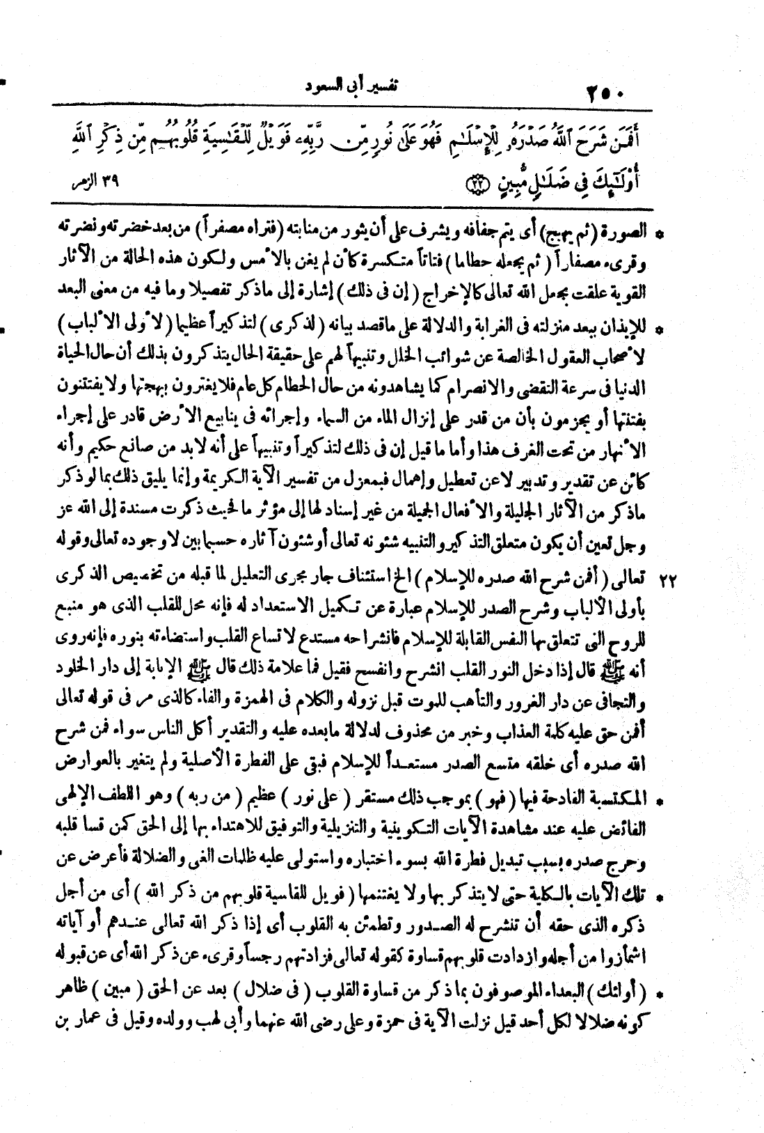 الزمر 22 الصُّورةِ {ثُمَّ يَهِيجُ} أي يتمُّ جفافُه ويشرف على أنْ يثورَ من منابتِه {فَتَرَاهُ مُصْفَرّاً} من بعد خُضرتِه ونُضرتِه وقُرىء مُصفارَّا {ثُمَّ يَجْعَلُهُ حطاما} فُتاتاً مُتكسِّرةً كأن لم يغنَ بالأمسِ ولكون هذه الحالةِ من الآثارِ القوَّيةِ عُلِّقت بجعلِ الله تعالى كالإخراجِ {إِنَّ فِى ذَلِكَ} إشارةٌ إلى ما ذُكر تفصيلاً وما فيه من معنى البُعد للإيذان ببُعد منزلتِه في الغَرابةِ والدِّلالةِ على ما قُصد بيانُه {لِذِكْرِى} لتذكيراً عظيماً {لاِوْلِى الالباب} لأصحابِ العقولِ الخالصةِ عن شوائبِ الخللِ وتنبيهاً لهم على حقيقةِ الحالِ يتذكَّرون بذلك أنَّ حالَ الحياةِ الدنيا في سرعة التقضى والانصرامِ كما يشاهدونَهُ من حال الحُطامِ كلَّ عامٍ فلا يغترُّون ببهجتِها ولا يُفتتنون بفتنتها أو يجزمون بأن مَن قدَر على إنزالِ الماءِ من السَّماءِ وإجرائِه في ينابيع الأرضِ قادرٌ على إجراءِ الأنهارِ من تحتِ الغُرفِ هذا وأمَّا مَا قيلَ إنَّ في ذلك لتذكيراً وتنبيهاً على أنَّه لا بُدَّ من صانعٍ حكيمٍ وأنه كائنٌ عن تقديرٍ وتدبيرٍ لا عن تعطيلٍ وإهمالٍ فبمعزلٍ من تفسيرِ الآيةِ الكريمةِ وإنَّما يليقُ ذلك بما لو ذُكرَ ما ذُكر من الآثارِ الجليلة والأفعالِ الجميلةِ من غيرِ إسنادٍ لها إلى مؤثِّرٍ ما فحيثُ ذُكرتْ مسندةً إلى الله عزَّ وجلَّ تعيَّن أنْ يكونَ متعلَّقُ التذكير والتنبيه شئونه تعالى أوشئون آثارِه حسبما بُيِّن لا وجودُه تعالى وقولُه تعالى