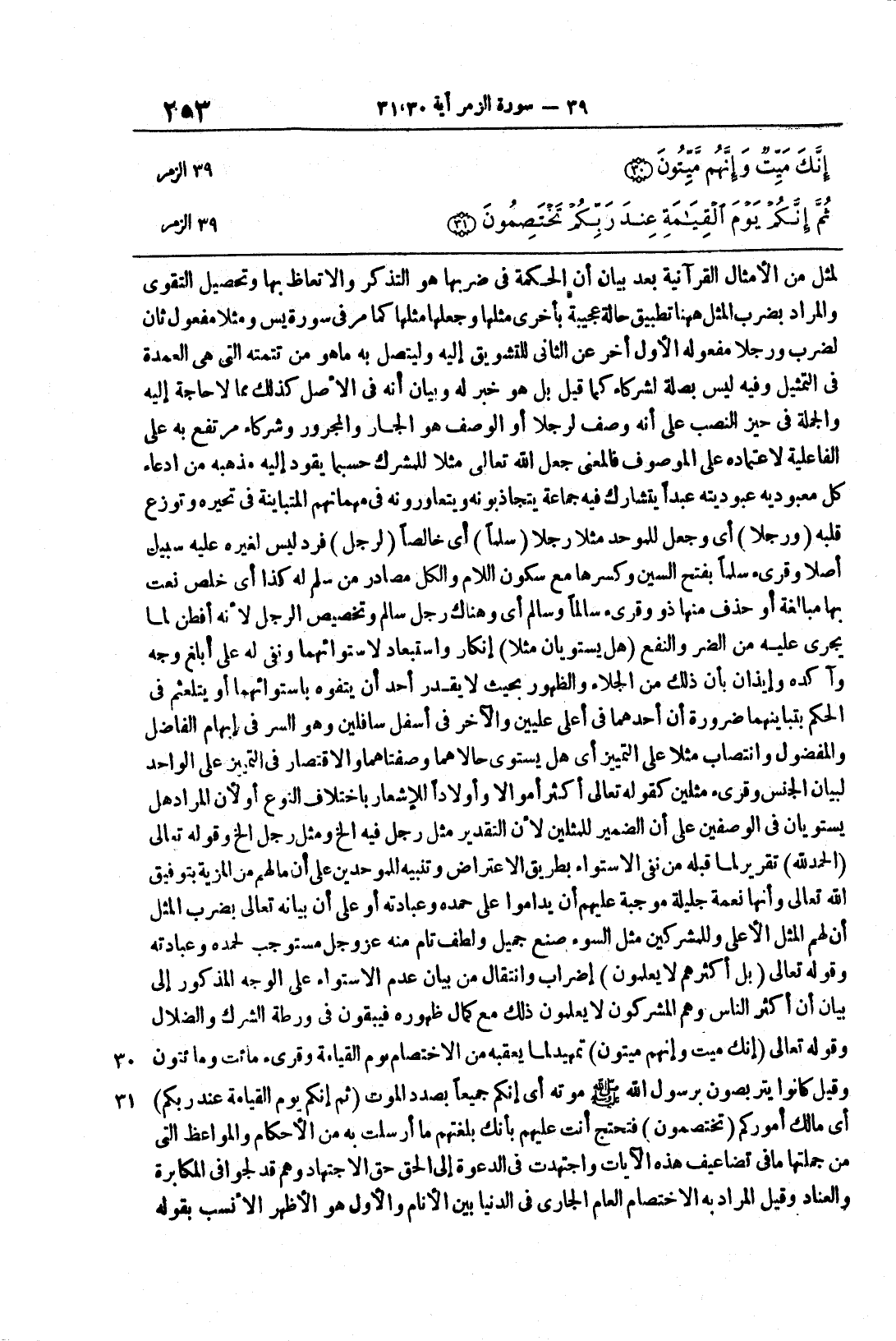 الزمر 30 31 لمثلٍ من الأمثالِ القُرآنيةِ بعد بيانِ أنَّ الحكمةَ في ضربِها هو التَّذكُّر والاتِّعاظُ بها وتحصيلُ التَّقوى والمرادُ بضربِ المثل هَهُنا تطبيقُ حالةٍ عجيبةٍ بأُخرى مثلِها وجعلِها مثلَها كما مر في سورة يس ومثلاً مفعولٌ ثانٍ لضربَ ورجلاً مفعولُه الأوَّلُ أُخِّر عن الثَّانِي للتَّشويقِ إليه وليتَّصلَ به ما هُو من تتمتِه التي هي العُمدةُ في التَّمثيلِ وفيه ليسَ بصلةٍ لشركاءِ كما قيل بل هُو خبرٌ له وبيانُ أنَّه في الأصلِ كذلكَ مَّما لا حاجةَ إليهِ والجملةُ في حيز النصبِ على أنه وصفٌ لرجلاً أو الوصفُ هو الجارُّ والمجرورُ وشركاء مرتفعٌ به على الفاعليةِ لاعتمادِه على الموصوفِ فالمعنى جعلَ الله تعالى مثلاً للمشركِ حسبَما يقودُ إليهِ مذهبُه من ادَّعاءِ كلَ معبوديه عبوديتَه عبداً يتشاركُ فيه جماعة يتجاذبونه ويتعاورُونه في مهمَّاتهم المتباينةِ في تحيُّرِه وتوزُّعِ قلبه {وَرَجُلاً} أي وجعل للموحِّد مثلاً رجلا {سلما} أي خالصاً {لِرَجُلٍ} فردٍ ليس لغيره عليه سبيل اصلا وقرىء سلما بفتح السين وكسرِها مع سكون الَّلامِ والكُلُّ مصادرٌ من سَلِم له كذا أي خلص نعت بها مبالغةً أو حُذف منها ذُو وقِرىء سالماً وسالم أي وهناك رجلٌ سالم وتخصيصُ الرَّجُلِ لأنَّه أفطن لما يجري عليه من الضُّرِّ والنَّفعِ {هَلْ يَسْتَوِيَانِ مَثَلاً} إنكارٌ واستبعاد لاستوائِهما ونفيٌ له على أبلغِ وجهٍ وآكدِه وإيذانٌ بأنَّ ذلك من الجلاء والظُّهور بحيثُ لا يقدرُ أحدٌ أنْ يتفوَّه باستوائِهما أو يتلعثم في الحُكم بتباينهما ضرورةَ أنَّ أحدهما في أعلى عِلِّيِّينَ والآخرُ في أسفلِ سافلينَ وهو السِّرُّ في إبهام الفاضلِ والمفضولِ وانتصاب مثلاً على التَّمييزِ أي هل يستوي حالاهُما وصفتاهُما والاقتصارُ في التَّمييزِ على الواحد لبيان الجنسِ وقُرىء مَثَلين كقوله تعالى اكثر اموالا واولادا باختلاف النَّوعِ أو لأنَّ المرادَ هل يستويانِ في الوصفين على أنَّ الضَّميرَ للمثلينِ لأنَّ التَّقديرَ مَثَلُ رجلٍ فيه الخ ومَثَلُ رجلٍ الخ وقولُه تعالى {الحمد للَّهِ} تقريرٌ لما قبلَهُ من نفيِ الاستواءِ بطريقِ الاعتراضِ وتنبيهٌ للموحِّدين على ان مالهم من المزَّيةِ بتوفيقِ الله تعالى وأنَّها نعمةٌ جليلةٌ موجبة عليهم ان يداموا على حمدِه وعبادتِه أو على أنَّ بيانه تعالى بضرب المثل أن لهم المثل الأعلى وللمشركين مثل السَّوء صنعٌ جميلٌ ولطفٌ تامٌّ منه عزَّ وجلَّ مستوجبٌ لحمدِه وعبادتِه وقولُه تعالى {بَلْ أَكْثَرُهُمْ لاَ يَعْلَمُونَ} إضرابٌ وانتقالٌ منِ بيانِ عدمِ الاستواءِ على الوجهِ المذكورِ إلى بيانِ ان اكثر الناس هم المشركون لا يعلمون ذلك مع كمالِ ظُهورِه فيبقون في ورطةِ الشِّركِ والضَّلالِ وقولُه تعالَى
