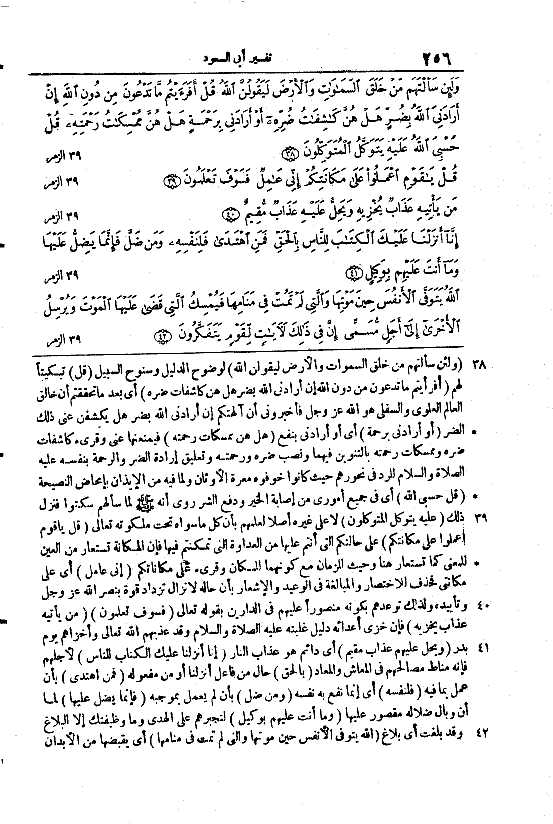 38 - 42 {وَلَئِن سَأَلْتَهُمْ مَّنْ خَلَقَ السماوات والأرض لَيَقُولُنَّ الله} لوضوحِ الدَّليلِ وسنوح السَّبيلِ {قُلْ} تبكيتاً لهُم {أَفَرَايْتُم مَّا تدعون من دون الله إن أرادنى الله بضر هَلْ هُنَّ كاشفات ضُرّهِ} أي بعد ما تحقَّقتُم أنَّ خالق العالم العلويَّ والسُّفليِّ هو الله عزَّ وجلَّ فأخبروني أن آلهتَكم إن أرادنى الله بضر هل يكشفنَ عنِّي ذلك الضُّرِّ {أَوْ أَرَادَنِى بِرَحْمَةٍ} أي أو أرادني بنفعٍ {هَلْ هُنَّ ممسكات رَحْمَتِهِ} فيمنعنها عنى وقرئ كاشفاتٌ ضرَّه وممسكاتٌ رحمتَه بالتَّنوينِ فيهما ونصبِ ضُرِّه ورحمته وتعليق إرادة الضُّرَّ والرَّحمةِ بنفسه عليه الصَّلاةُ والسَّلامُ للردِّ في نحورِهم حيث كانُوا خوّفوه معرَّةَ الأوثانِ ولما فيه من الإيذانِ بإمحاضٍ النَّصيحةِ {قُلْ حَسْبِىَ الله} أي في جميعِ أموري من إصابةِ الخير ودفعِ الشَّرِّ رُوي انه صلى الله عليه وسلم لمَّا سألهم سكتُوا فنزلَ ذلك {عَلَيْهِ يَتَوَكَّلُ المتوكلون} لا على غير أصلاً لعلمهم بأنَّ كلَّ ما سواه تحت ملكوتِه تعالى