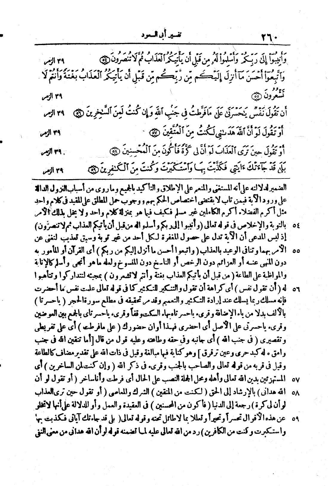 الزمر 54 59 الضَّميرِ لدلالتهِ على أنَّه المستغنِي والمنعمُ على الإطلاقِ والتأكيد بالجميعِ وما رُوي من أسبابِ النُّزولِ الدَّالَّةِ على ورود الآيةِ فيمن تابَ لا يقتضِي اختصاصَ الحكم بهم ووجوبُ حملِ المطلقِ على المقيِّد في كلامِ واحدٍ مثل أكرمِ الفضلاء أكرمِ الكاملينَ غيرُ مسلَّمٍ فكيف فيما هو بمنزلةِ كلامٍ واحدٍ ولا يخلُّ بذلك الأمرُ بالتَّوبةِ والإخلاصِ في قوله تعالى