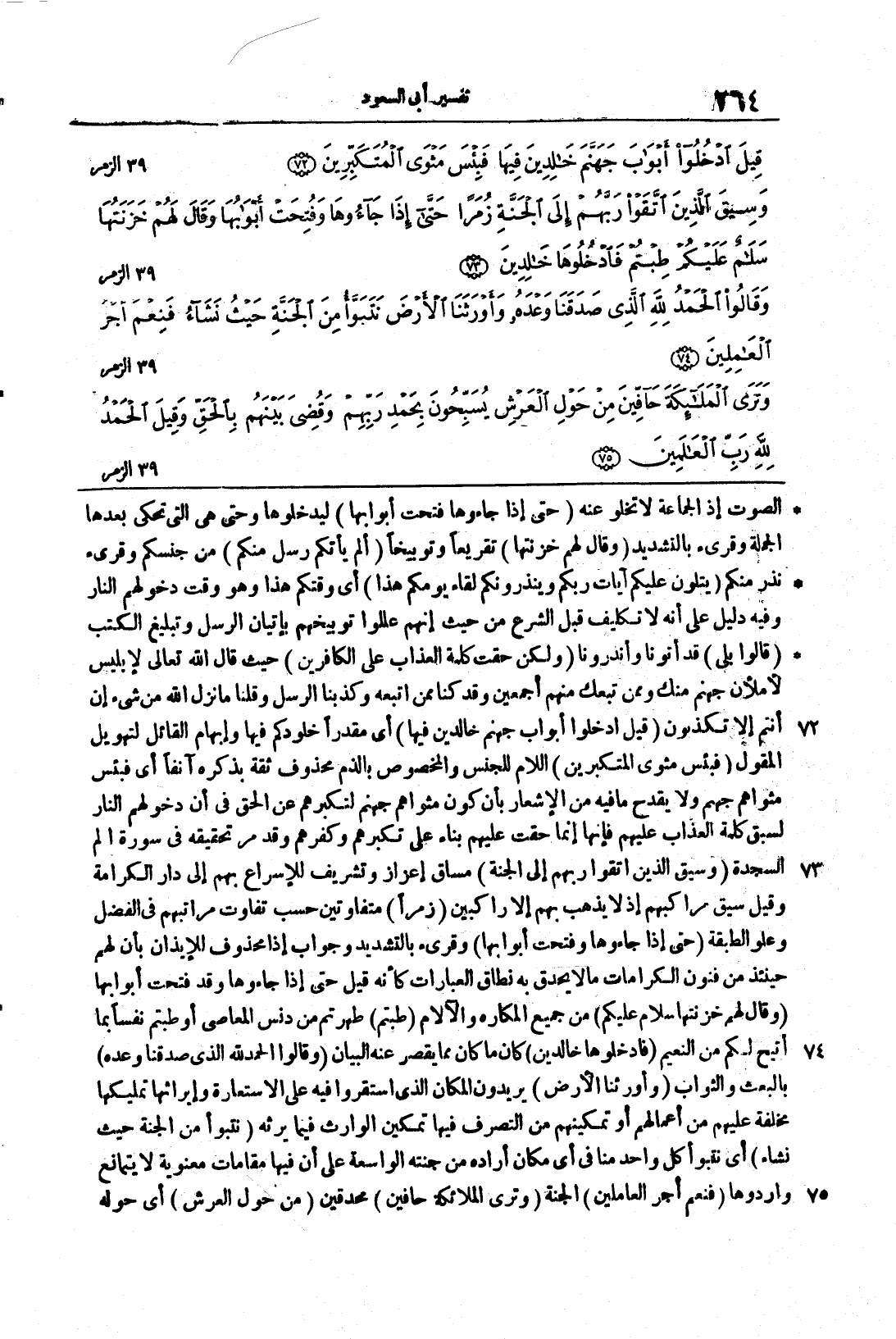 الزمر 72 75 الصَّوتُ إذِ الجماعةُ لا تخلُو عنه {حتى إِذَا جاؤوها فُتِحَتْ أبوابها} ليدخلُوها وحتَّى هي التي تُحكى بعدها الجملةُ وقرىء بالتَّشديدِ {وَقَالَ لَهُمْ خَزَنَتُهَا} تقريعاً وتوبيخاً {ألم يأتكم رسل منكم} من جنسِكم وقُرىء نُذُر منكم {يتلون عليكم آيات ربكم وينذرونكم لِقَاء يَوْمِكُمْ هذا} أيْ وقتِكم هذا وهو وقتُ دخولِهم النَّارَ وفيه دليلٌ على أنَّه لا تكليفَ قبل الشِّرعِ من حيثُ أنَّهم علَّلوا توبيخَهم بإتيان الرُّسلِ وتبليغَ الكُتبِ {قَالُواْ بلى} قد أنونا وأندرونا {ولكن حَقَّتْ كَلِمَةُ العذاب عَلَى الكافرين} حيثُ قال الله تعالى لإبليسَ لأَمْلاَنَّ جَهَنَّمَ مِنكَ وَمِمَّن تَبِعَكَ مِنْهُمْ أَجْمَعِينَ وقد كنَّا ممن اتبعه وكذَّبنا الرُّسلَ وَقُلْنَا مَا نَزَّلَ الله من شئ إن أنتم إلا تكذبون