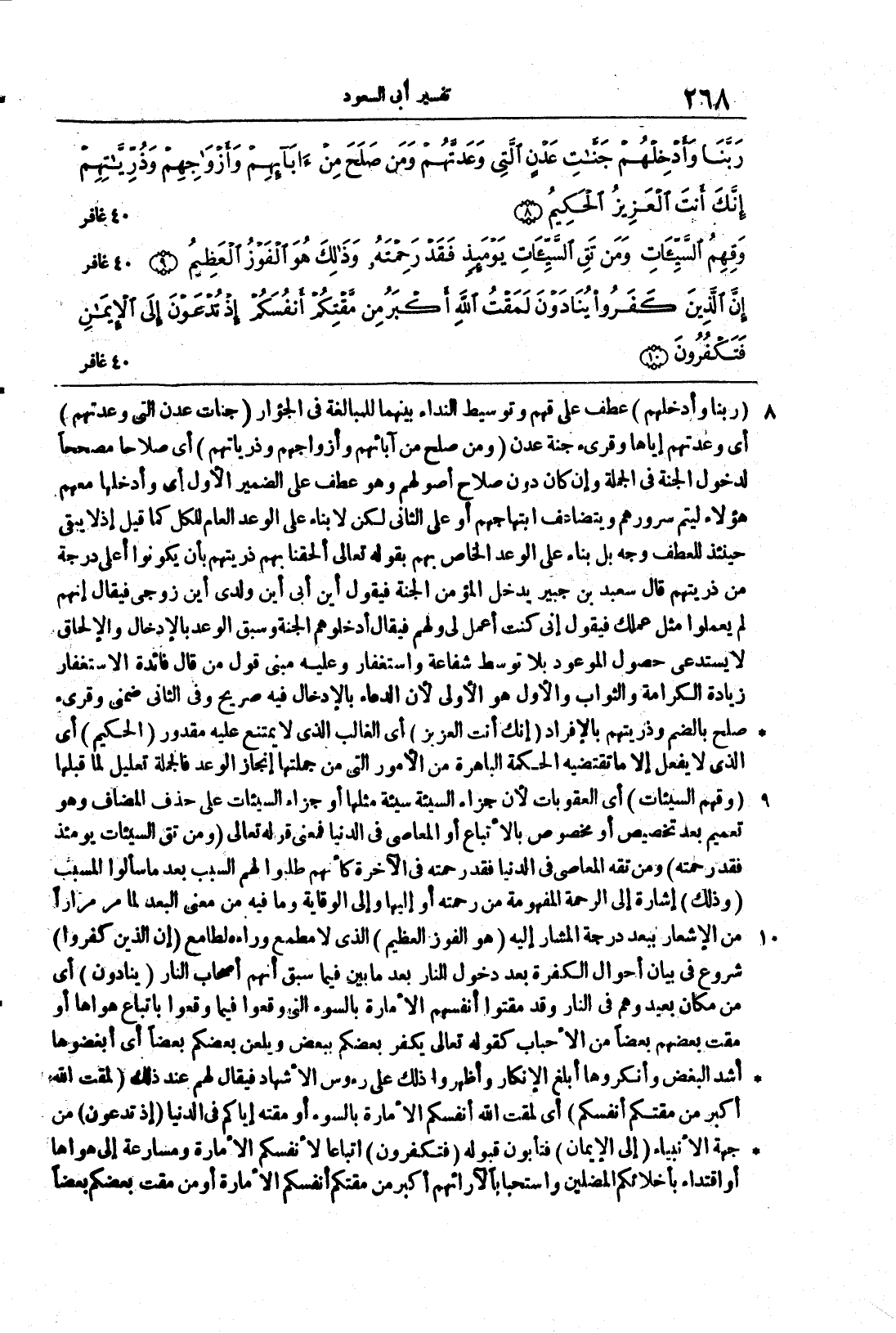 8 - 10 {رَبَّنَا وَأَدْخِلْهُمْ} عطفٌ عَلى قِهِمْ وتوسيطُ النداءِ بينَهما للمبالغة في الجؤارِ {جنات عَدْنٍ التى وَعَدْتَّهُمْ} أيْ وعَدَتهم إياها وقرئ جَنَّةَ عَدْنٍ {وَمَنْ صَلَحَ من آبائهم وأزواجهم وَذُرّيَّاتِهِمْ} أيْ صلاحاً مصحَّحاً لدخولِ الجنةِ في الجملةِ وإنْ كانَ دونَ صلاحِ أصولِهم وهُوَ عطفٌ على الضميرِ الأولِ أيْ وأدخلها معهم هؤلاء ليتم سرورهم ويتصاعف ابتهاجُهم أوْ عَلى الثانِي لكنْ لا بناءً عَلى الوعدِ العام للكلِّ كما قيلَ إذْ لا يقي حينئذ للعطف وجه بل بناء على الوعد الخاصِّ بهمْ بقولِه تعالَى أَلْحَقْنَا بِهِمْ ذُرّيَّتَهُمْ بأنْ يكونُوا أعلى درجةً منْ ذريتِهم قالَ سعيدُ بنُ جُبيرٍ يدخلُ المؤمنُ الجنةَ فيقولُ أينَ أبي أينَ ولدي أينَ زَوْجي فيقالُ إِنَّهم لمْ يعملُوا مثلَ عملكَ فيقولُ إني كنتُ أعملُ لي ولهُم فيقالُ أَدخلوهم الجنةَ وسبقُ الوعدِ بالإدخالِ والإلحاقِ لاَ يستدعي حصولَ الموعودِ بلا توسطِ شفاعةٍ واستغفارٍ وعليهِ مَبْنى قولِ منْ قالَ فائدةُ الاستغفارِ زيادةُ الكرامةِ والثوابِ والأولُ هو الأَولى لأنَّ الدعاءَ بالإدخالِ فيه صريحٌ وفي الثاني ضمنى وقرئ صَلُح بالضَّمِ وذرّيتِهمُ بالإفرادِ {إِنَّكَ أَنتَ العزيز} أي الغالبُ الذَّي لاَ يمتنعُ عليه مَقْدورٌ {الحكيم} أي الذي لا يفعلُ إلا ما تقتضيهِ الحكمةُ الباهرةُ من الأمور التي من جُمْلتها إنجازُ الوعدِ فالجملةُ تعليلٌ لما قَبْلها