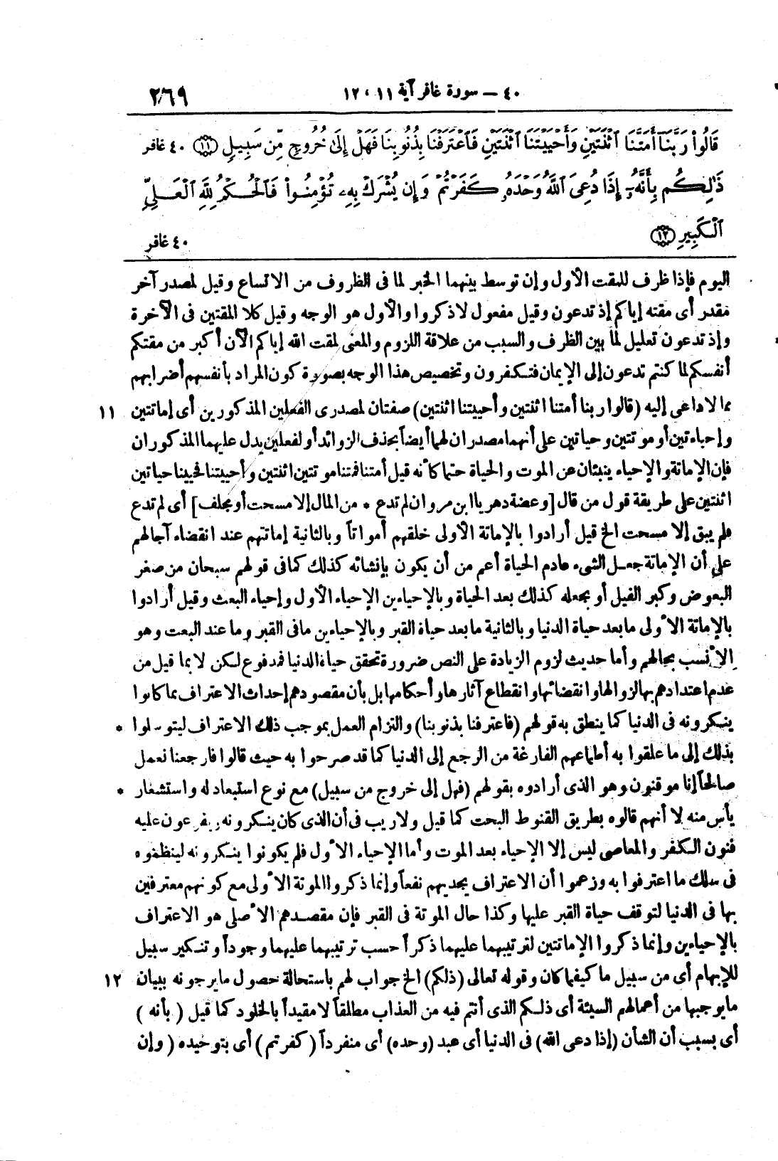 غافر 11 12 اليوم فإذا ظرفٌ للمقتِ الأولِ وإنْ توسطَ بينَهما الخبرُ لما فِي الظروفِ من الاتساعِ وقيل لمصدرٍ آخرَ مقدرٍ أيْ مقتُه إيَّاكم إذْ تدعونَ وقيلَ مفعولٌ لأذكرُوا والأولُ هو الوجْه وقيلَ كلا المقتينِ في الآخرةِ وإذْ تدعَونَ تعليلٌ لَما بينَ الظرفِ والسببِ منْ علاقةِ اللزومِ والمعنى لمقتُ الله إِيَّاكم الآنَ أكبرُ منْ مقتكم أنفسَكم لمَّا كنتمُ تُدعَونَ إِلى الإيمانِ فتكفرونَ وتخصيصُ هَذَا الوجهِ بصورةِ كونِ المرادِ بأنفسِهم أضرابَهُم مما لاَ دَاعيَ إليهِ