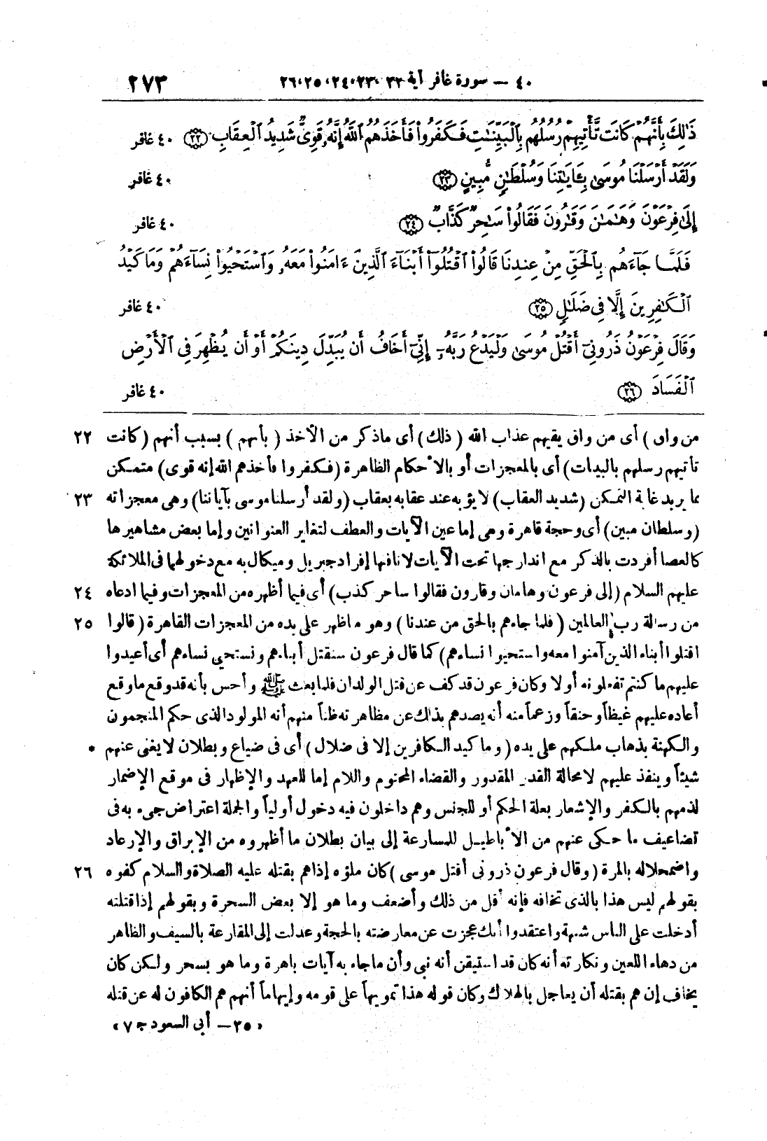 {ولقد أرسلنا موسى بآياتنا} وهي معجزاتُه {وسلطان مُّبِينٍ} أي وحجَّةٍ قاهرةٍ وهيَ إما عينُ الآياتِ والعطفُ لتغايرِ العنوانينِ وإما بعضُ مشاهيرِها كالعَصا أفردتْ بالذكرِ مع اندراجِها تحتَ الآياتِ لأن فيها إفرادَ جبريلَ وميكالَ به مع دخولهما في الملائكةِ عليهم السَّلامُ