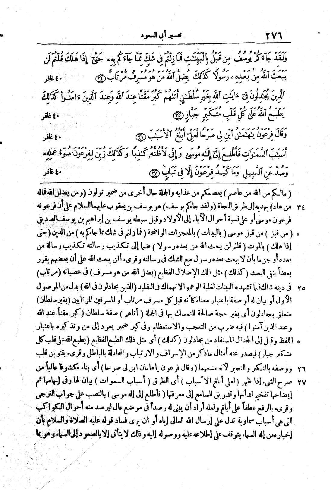 {وَلَقَدْ جَاءكُمْ يُوسُفُ} هو يوسفُ بنِ يعقوبَ عليهما السَّلامُ على أنَّ فرعونَهُ فرعونُ موسى أو على نسبةِ أحوالِ الآباءِ إلى الأولادِ وقيلَ سِبْطُه يوسفُ بنُ إبراهيمَ بنِ يوسفَ الصدِّيقِ {مِن قَبْلُ} من قبلِ موُسى {بالبينات} بالمعجزاتِ الواضحةِ {فَمَا زِلْتُمْ فِى شَكّ مّمَّا جَاءكُمْ بِهِ} من الدينِ {حتى إِذَا هَلَكَ} بالموتِ {قُلْتُمْ لَن يَبْعَثَ الله مِن بَعْدِهِ رَسُولاً} ضمَّاً إلى تكذيبِ رسالتِه تكذيبَ رسالةِ مَنْ بعدَهُ أو جزماً بأنْ لا يُبعثَ بعدَهُ رسولٌ معَ الشكِّ في رسالتِه وقُرِىءَ ألنْ يبعثَ الله على أنَّ بعضَهُم يقررُ بعضاً بنفي البعثِ {كذلك} مثل ذلكَ الإضلالِ الفظيعِ {يُضِلُّ الله مَنْ هُوَ مُسْرِفٌ} في عصيانِه {مُّرْتَابٌ} في دينِه شاكٌّ فيما تشهدُ به البيناتُ لغلبةِ الوهمِ والانهماكِ في التقليدِ
