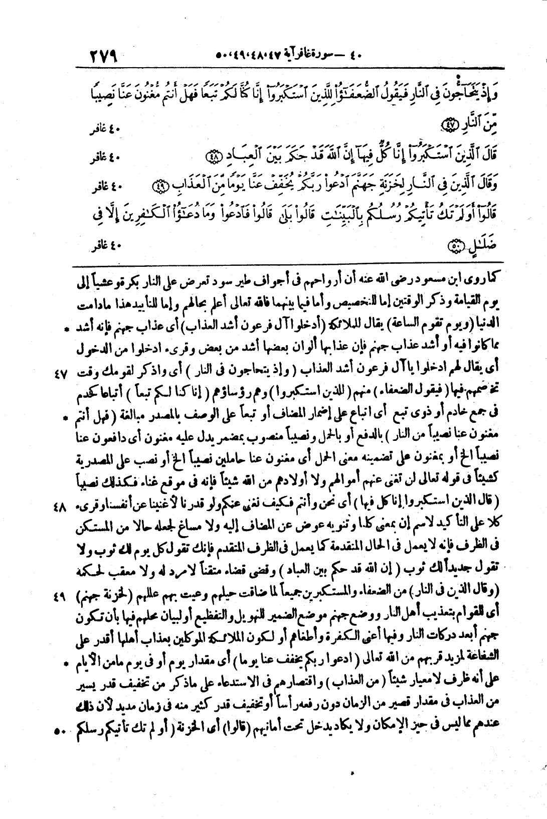 غافر 47 50 كما رَوَىَ ابنُ مسعودٍ رضي الله عنه إن أرواحَهم في أجوافٍ طيرٍ سُودٍ تُعرضُ على النَّارِ بُكرةً وعشياً إلى يومِ القيامةِ وذكرُ الوقتينِ إمَّا للتخصيصِ وإمَّا فيما بينهُمَا فالله تعالَى أعلمُ بحالِهم واما للتأييد هذا ما دامتِ الدُّنيا {وَيَوْمَ تَقُومُ الساعة} يقالُ للملائكة {أدخلوا آلَ فرعونَ أشدَّ العذابِ} أي عذابَ جهنَم فإنَّه أشدُّ ممَّا كانُوا فيه أو أشدّ عذابِ جهنَم فإنَّ عذابَها ألوانٌ بعضُها أشدُّ من بعضٍ وقُرىءَ ادخُلُوا من الدخولِ أي يُقالُ لهم ادخُلُوا يا آلَ فرعونَ أشدَّ العذابِ