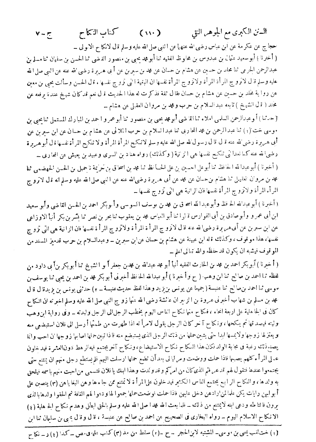 (حدثنا) أبو عبد الرحمن السلمى املاء ثنا القاضى أبو محمد يحيى بن منصور ثنا أبو عمرو احمد بن المبارك المستملى ثنا يحيى بن موسى خت (1) ثنا عبد الرحمن بن محمد المحاربي ثنا عبد السلام بن حرب الملائى عن هشام بن حسان عن ابن سيرين عن أبى هريرة رضى الله عنه قال قال رسول الله صلى الله عليه وسلم لا تنكح المرأة المرأة ولا تنكح المرأة نفسها قال أبو هريرة رضى الله عنه كما نعد التى تنكح نفسها هي الزانية (وكذلك) رواه هناد بن السرى وعبيد بن يعيش عن المحاربي