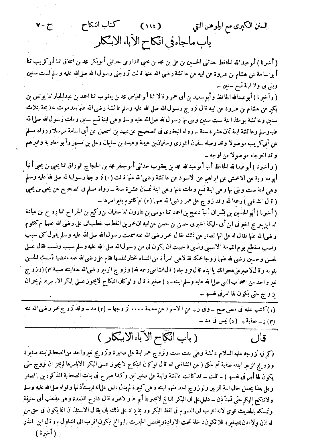 ذكر فيه نزوجه عليه السلام عائشة وهى بنت ست وتزوج عمر ابنة على صغيرة وتزويج غير واحد من الصحابة ابنته صغيرة وتزويج الزبير ابنته صفية ثم حكى (عن الشافعي انه قال لو كان النكاح لا يجوز على البكر الا بامرها لم يجز ان تزوج حتى يكون لها أمر في نفسها) - قلت - قد كانت عائشة وابنة على صغيرتين وكذا صرح في بنات الصحابة المذكورين بالصغر وعلى هذا يحمل حال ابنة الزبير ولو زوج احد منهم ابنته وهى كبيرة لم يدل دليل على انه لم يستأذنها وقوله صلى الله عليه وسلم ولا تنكح البكر حتى تستأذن - دليل على ان البكر البالغ لا يجبرها أبوها ولا غيره قال شارح العمدة وهو مذهب أبى حنيفة وتمسكه بالحديث قوى لانه اقرب إلى العموم في لفظ البكر وربما يزاد على ذلك بان يقال الاستئذان انما يكون في حق من له اذن ولا اذن للصغيرة فلا تكون داخلة تحت الارادة ويختص الحديث بالبوالغ فيكون اقرب إلى التناول، وقال ابن المنذر
