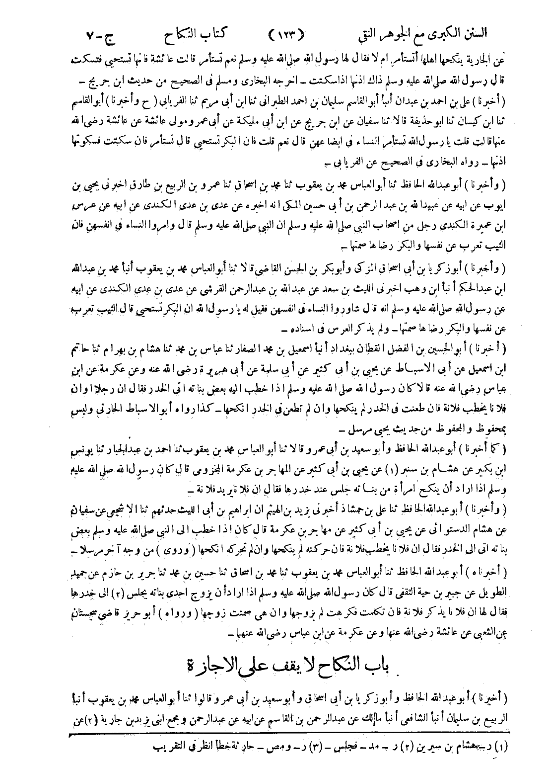 - (وأخبرنا) أبو عبد الله الحافظ ثنا على بن حمشاذ أخبرني يزيد بن الهيثم ان ابراهيم بن أبى الليث حدثهم ثنا الاشجعى عن سفيان عن هشام الدستوائى عن يحيى بن أبى كثير عن مهاجر بن عكرمة قال كان إذا خطب إلى النبي صلى الله عليه وسلم بعض بناته اتى إلى الخدر فقال ان فلانا يخطب فلانه فان حركته لم ينكحها وان لم تحركه انكحها (وروى) من وجه آخر مرسلا - (أخبرناه) أبو عبد الله الحافظ ثنا أبو العباس محمد بن يعقوب ثنا محمد بن اسحاق ثنا حسين بن محمد ثنا جرير بن حازم عن حميد الطويل عن جبير بن حية الثقفى قال كان رسول الله صلى الله عليه وسلم إذا اراد أن يزوج احدى بناته يجلس (2) إلى خدرها فقال لها ان فلانا يذكر فلانة فان تكلمت فكرهت لم يزوجها وان هي صمتت زوجها (ورواه) أبو حريز قاضى سجستان عن الشعبى عن عائشة رضى الله عنها وعن عكرمة عن ابن عباس رضى الله عنهما -