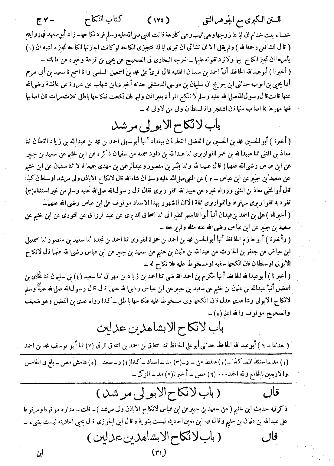 قال (باب لا نكاح الا ولى مرشد) ذكر فيه حديث ابن خثيم (عن سعيد بن جبير عن ابن عباس لا نكاح الا باذن ولى مرشد) - قلت - مداره موقوفا ومرفوعا على عبد الله بن عثمان بن خثيم وقال فيه ابن معين احاديثه ليست بقوية وقال ابن الجوزى قال يحيى احاديثه ليست بشئ - قال (باب لا نكاح الا بشاهدين عدلين)