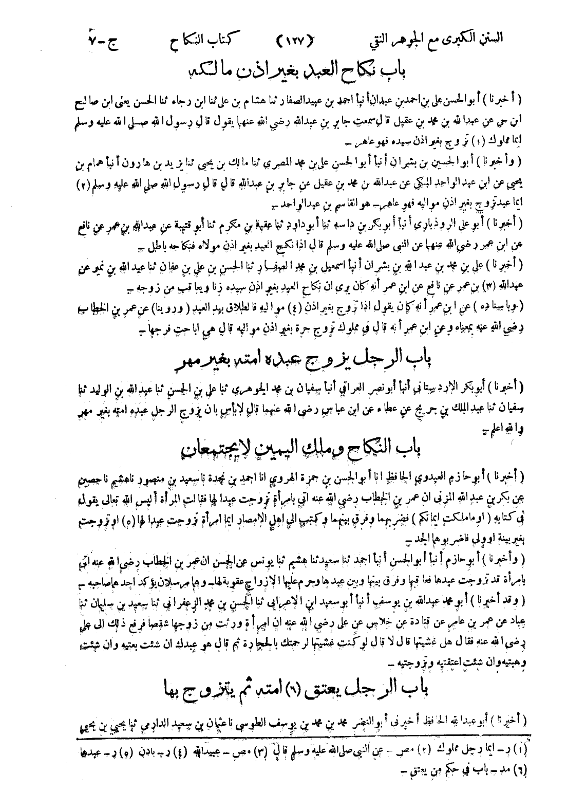 - (أخبرنا) على بن محمد بن عبد الله بن بشران أنبأ اسمعيل بن محمد الصفار ثنا الحسن بن على بن عفان ثنا عبد الله بن نمير عن عبد الله (3) بن عمر عن نافع عن ابن عمر أنه كان يروى ان نكاح العبد بغير اذن سيده زنا ويعاقب من زوجه - (وباسناده) عن ابن عمر أنه كان يقول إذا تزوج بغير اذن (4) مواليه فالطلاق بيد العبد
