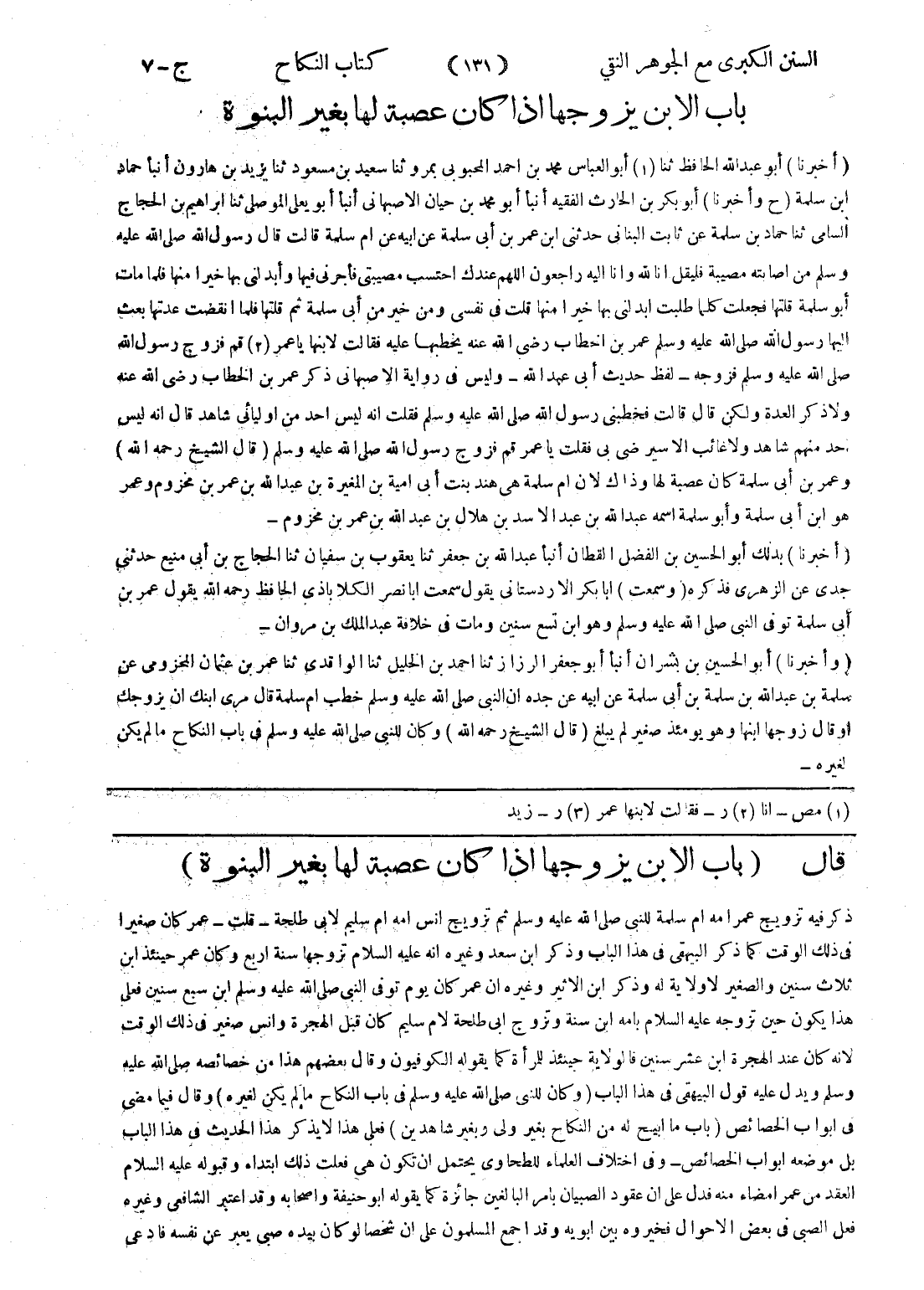 قال (باب الابن يزوجها إذا كان عصبة لها بغير البنوة) ذكر فيه تزويج عمر امه سلمة للنبى صلى الله عليه وسلم ثم تزويج انس امه ام سليم لابي طلحة - قلت - عمر كان صغيرا في ذلك الوقت كما ذكر البيهقى في هذا الباب وذكر ابن سعد وغيره انه عليه السلام تزوجها سنة اربع وكان عمر حينئذ ابن ثلاث سنين والصغير لا ولاية له وذكر ابن الاثير وغيره ان عمر كان يوم توفى النبي صلى الله عليه وسلم ابن سبع سنين فعلى هذا يكون حين تزوجه عليه السلام بامه ابن سنة وتزوج ابى طلحة لام سليم كان قبل الهجرة وانس صغير في ذلك الوقت لانه كان عند الهجرة ابن عشر سنين فالولاية حينئذ للمرأة كما يقوله الكوفيون وقال بعضهم هذا من خصائصه صلى الله عليه وسلم ويدل عليه قول البيهقى في هذا الباب (وكان للنبى صلى الله عليه وسلم في باب النكاح ما لم يكن لغيره) وقال فيما مضى في ابواب الخصائص (باب ما ابيح له من النكاح بغير ولى وبغير شاهدين) فعلى هذا لا يذكر هذا الحديث في هذا الباب بل موضعه ابواب الخصائص - وفي اختلاف العلماء للطحاوي يحتمل ان تكون هي فعلت ذلك ابتداء وقبوله عليه السلام العقد من عمر امضاء منه فدل على ان عقود الصبيان بامر البالغين جائزة كما يقوله أبو حنيفة واصحابه وقد اعتبر الشافعي وغيره فعل الصبى في بعض الاحوال فخيروه بين ابويه وقد اجمع المسلمون على ان شخصا لو كان بيده صبى يعبر عن نفسه فادعى