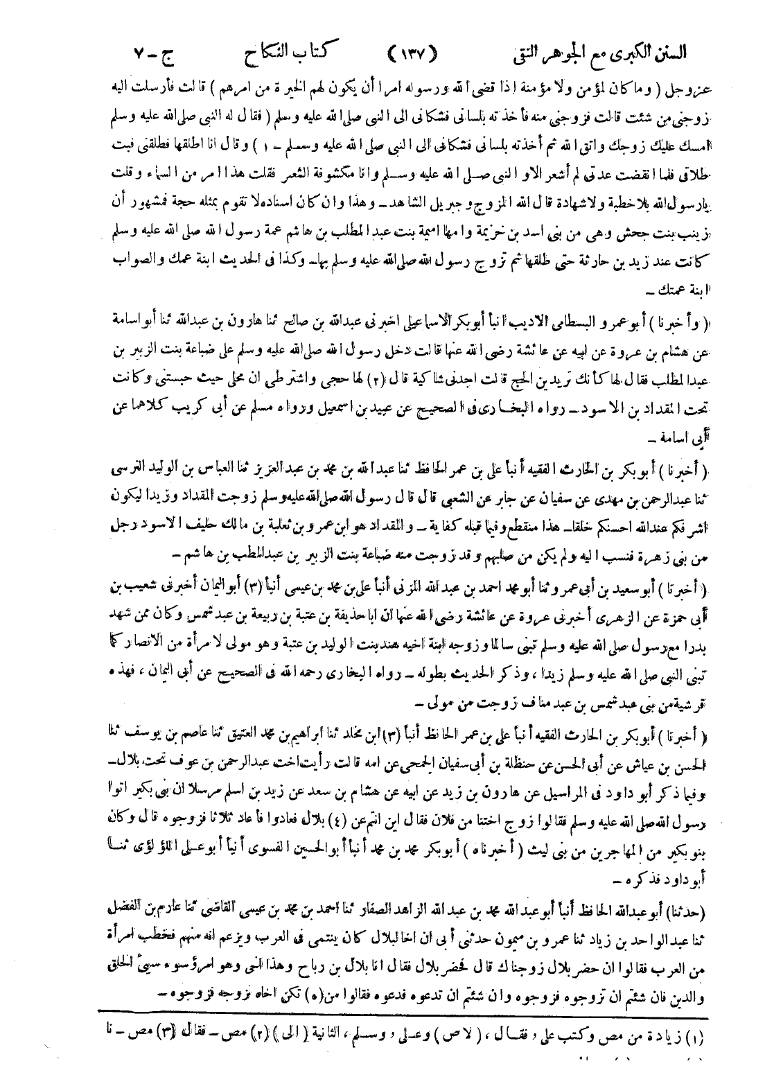 - (أخبرنا) أبو بكر بن الحارث الفقيه أنبأ على بن عمر الحافظ أنبأ (3) ابن مخلد ثنا ابراهيم بن محمد العتيق ثنا عاصم بن يوسف ثنا الحسن بن عياش عن أبى الحسن عن حنظلة بن أبى سفيان الجمحى عن امه قالت رأيت اخت عبد الرحمن بن عوف تحت بلال - وفيما ذكر أبو داود في المراسيل عن هارون بن زيد عن ابيه عن هشام بن سعد عن زيد بن اسلم مرسلا ان بنى بكير اتوا رسول الله صلى الله عليه وسلم فقالوا زوج اختنا من فلان فقال اين انتم عن (4) بلال فعادوا فأعاد ثلاثا فزوجوه قال وكان بنو بكير من المهاجرين من بنى ليث (أخبرناه) أبو بكر محمد بن محمد أنبأ أبو الحسين الفسوى أنبأ أبو على اللؤلؤي ثنا أبو داود فذكره -