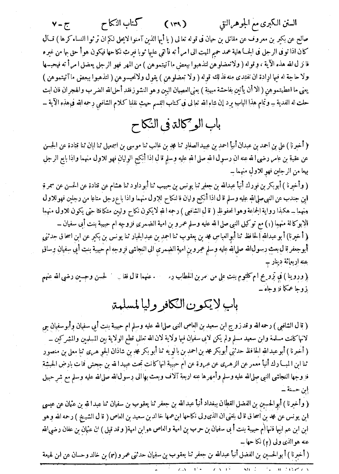 (وروينا) في تزويج ام كلثوم بنت على من عمر بن الخطاب رضى الله عنهما قال فقال على لحسن وحسين رضى الله عنهم زوجا عمكما فزوجاه - باب لا يكون الكافر وليا لمسلمة (قال الشافعي) رحمه الله وقد زوج ابن سعيد بن العاص النبي صلى الله عليه وسلم ام حبيبة بنت أبى سفيان وأبو سفيان حى لانها كانت مسلمة وابن سعيد مسلم ولم يكن لابي سفيان فيها ولاية لان الله تعالى قطع الولاية بين المسلمين والمشركين