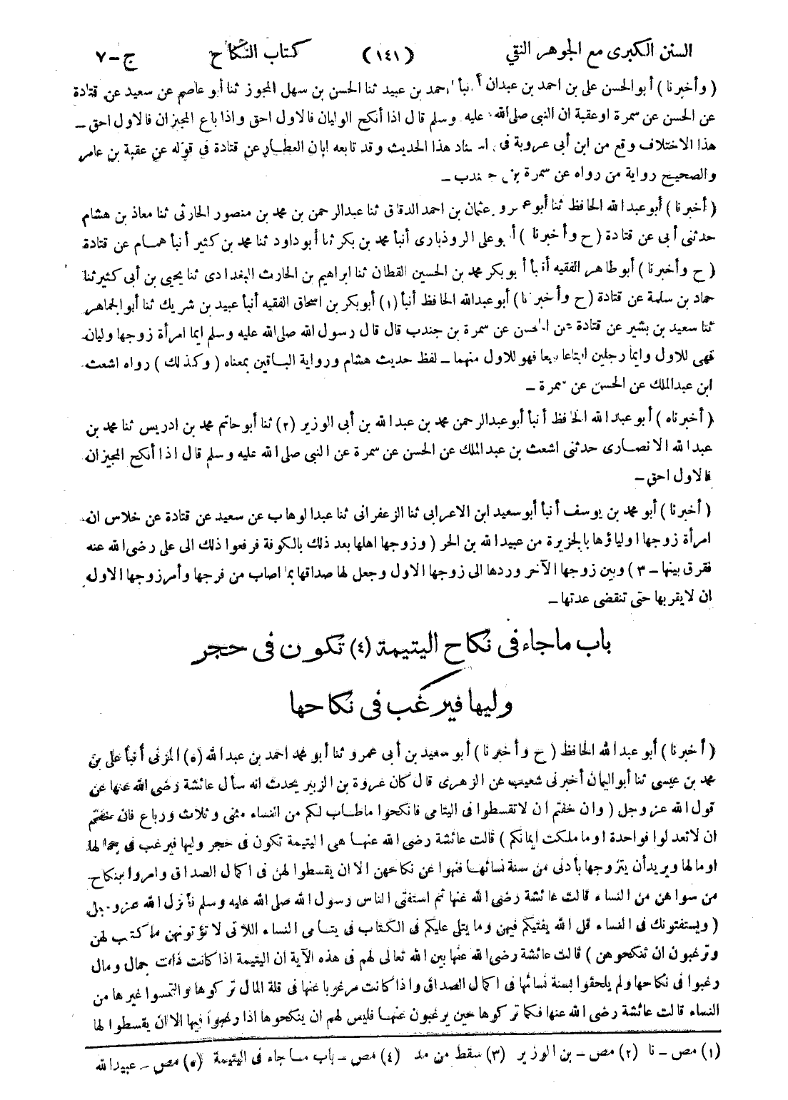 - (أخبرنا) أبو محمد بن يوسف أنبأ أبو سعيد ابن الاعرابي ثنا الزعفراني ثنا عبد الوهاب عن سعيد عن قتادة عن خلاس ان امرأة زوجها اولياؤها بالجزيرة من عبيدالله بن الحر (وزوجها اهلها بعد ذلك بالكوفة فرفعوا ذلك إلى على رضى الله عنه ففرق بينها - 3) وبين زوجها الاخر وردها إلى زوجها الاول وجعل لها صداقها بما اصاب من فرجها وأمر زوجها الاول ان لا يقربها حتى تنقضي عدتها - باب ما جاء في نكاح اليتيمة (4) تكون في حجر وليها فيرغب في نكاحها