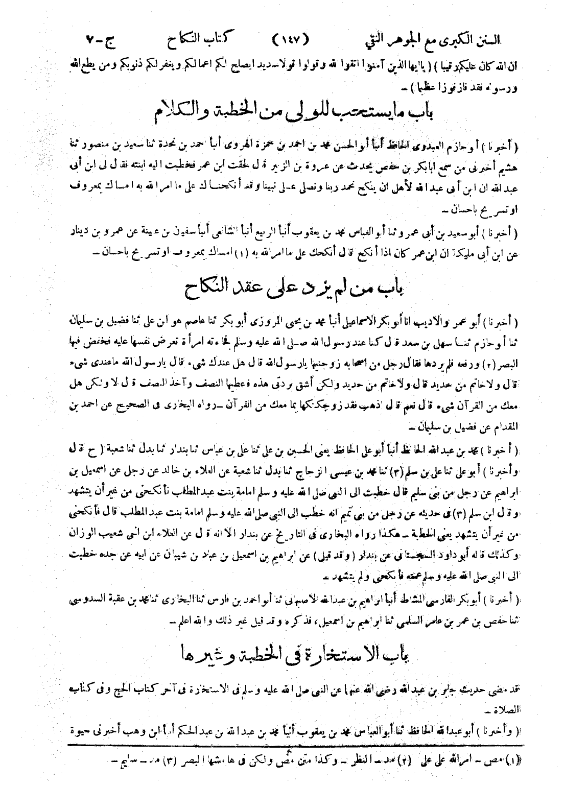 (أخبرنا) أبو حازم العبدوى الحافظ أنبأ أبو الحسن محمد بن احمد بن حمزة الهروي أنبأ احمد بن نحدة ثنا سعيد بن منصور ثنا هشيم أخبرني من سمع ابا بكر بن حفص يحدث عن عروة بن الزبير قال لحقت ابن عمر فخطبت إليه ابنته فقال لى ابن أبى عبد الله ان ابن أبى عبد الله لاهل ان ينكح نحمد ربنا ونصلي على نبينا وقد أنكحناك على ما امر الله به امساك بمعروف أو تسريح باحسان