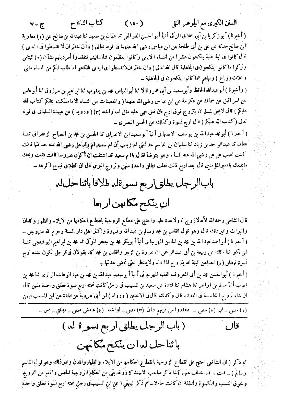 قال (باب الرجل يطلق اربع نسوة له) بائنا حل له ان ينكح مكانهن ثم ذكر (ان الشافعي احتج على انقطاع الزوجية بانقطاع احكامها من الايلاء والظهار واللعان وغير ذلك وهو قول القاسم وسالم) - قلت - قد اختلف عنهما كذا ذكر صاحب الاستذكار وقد بقى من احكام الزوجية الحبس والمنع من التزويج ولحوق النسب والكسوة والنفقة ان كانت حاملا - ثم ذكر البيهقى (عن ابن المسيب في رجل تحته اربع نسوة فطلق واحدة