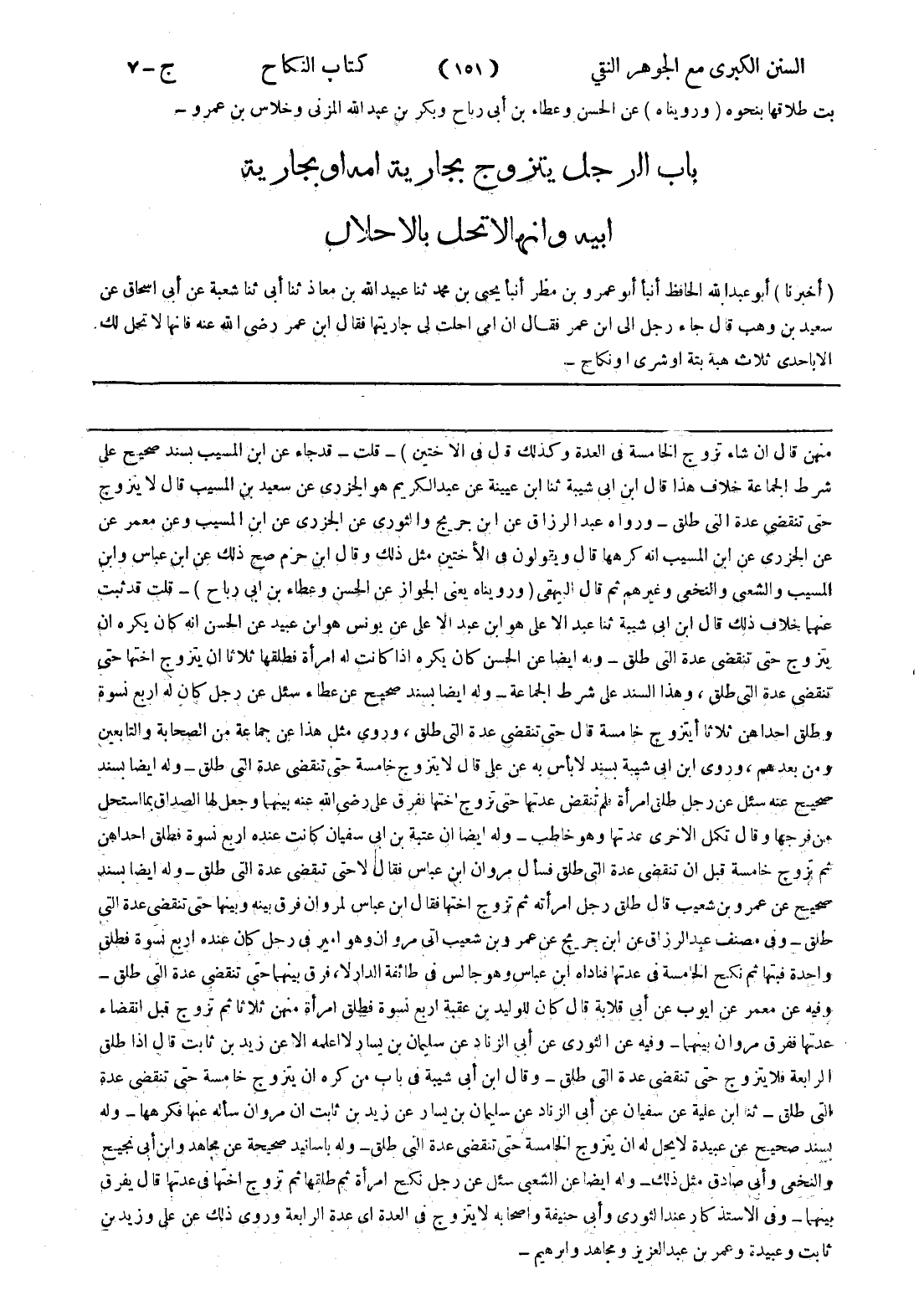 شرط الجماعة خلاف هذا قال ابن ابى شيبة ثنا ابن عيينة عن عبد الكريم هو الجزرى عن سعيد بن المسيب قال لا يتزوج حتى تنقضي عدة التى طلق - ورواه عبد الرزاق عن ابن جريج والثوري عن الجزرى عن ابن المسيب وعن معمر عن عن الجزرى عن ابن المسيب انه كرهها قال ويقولون في الاختين مثل ذلك وقال ابن حزم صح ذلك عن ابن عباس وابن المسيب والشعبى والنخعي وغيرهم ثم قال البيهقى (ورويناه يعنى الجواز عن الحسن وعطاء بن ابى رباح) - قلت قد ثبت عنهما خلاف ذلك قال ابن ابى شيبة ثنا عبد الاعلى هو ابن عبد الاعلى عن يونس هو ابن عبيد عن الحسن انه كان يكره ان يتزوج حتى تنقضي عدة التى طلق - وبه ايضا عن الحسن كان يكره إذا كانت له امرأة فطلقها ثلاثا ان يتزوج اختها حتى تنقضي عدة التى طلق، وهذا السند على شرط الجماعة - وله ايضا بسند صحيح عن عطاء سئل عن رجل كان له اربع نسوة وطلق احدا هن ثلاثا أيتزوج خامسة قال حتى تنقضي عدة التى طلق، وروى مثل هذا عن جماعة من الصحابة والتابعين ومن بعدهم، وروى ابن ابى شيبة بسند لا بأس به عن على قال لا يتزوج خامسة حتى تنقضي عدة التى طلق - وله ايضا بسند صحيح عنه سئل عن رجل طلق امرأة فلم تنقض عدتها حتى تزوج اختها ففرق على رضى الله عنه بينهما وجعل لها الصداق بما استحل من فرجها وقال تكمل الاخرى عدتها وهو خاطب - وله ايضا ان عتبة بن ابى سفيان كانت عنده اربع نسوة فطلق احدا هن ثم تزوج خامسة قبل ان تنقضي عدة التى طلق فسأل مروان ابن عباس فقال لا حتى تنقضي عدة التى طلق - وله ايضا بسند صحيح عن عمرو بن شعيب قال طلق رجل امرأته ثم تزوج اختها فقال ابن عباس لمروان فرق بينه وبينها حتى تنقضي عدة التى طلق - وفي مصنف عبد الرزاق عن ابن جريج عن عمرو بن شعيب اتى مروان وهو امير في رحل كان عنده اربع نسوة فطلق واحدة فبتها ثم نكح الخامسة في عدتها فناداه ابن عباس وهو جالس في طائفة الدار لا، فرق بينهما حتى تنقضي عدة التى طلق - وفيه عن معمر عن ايوب عن أبى قلابة قال كان للوليد بن عقبة اربع نسوة فطلق امرأة منهن ثلاثا ثم تزوج قبل انقضاء عدتها ففرق مروان بينهما - وفيه عن الثوري عن أبى الزناد عن سليمان بن يسار لا اعلمه الا عن زيد بن ثابت قال إذا طلق الرابعة فلا يتزوج حتى تنقضي عدة التى طلق - وقال ابن أبى شيبة في باب من كره ان يتزوج خامسة حتى تنقضي عدة التى طلق - ثنا ابن علية عن سفيان عن أبى الزناد عن سليمان بن يسار عن زيد بن ثابت ان مروان سأله عنها فكرهها - وله بسند صحيح عن عبيدة لا يحل له ان يتزوج الخامسة حتى تنقضي عدة التى طلق - وله باسانيد صحيحة عن مجاهد وابن أبى نجيح والنخعي وأبى صادق مثل ذلك - وله ايضا عن الشعبى سئل عن رجل نكح امرأة ثم طلقها ثم تزوج اختها في عدتها قال يفرق بينهما - وفي الاستذكار عند الثوري وأبى حنيفة واصحابه لا يتزوج في العدة أي عدة الرابعة وروى ذلك عن على وزيد بن