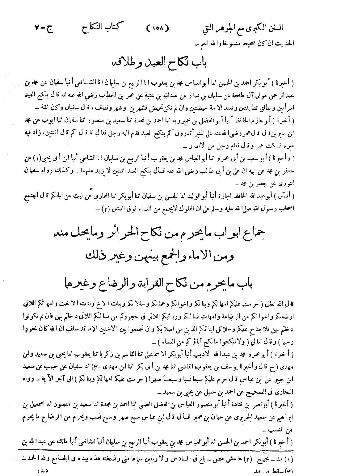 - (أخبرنا) أبو عمرو محمد بن عبد الله الاديب أنبأ أبو بكر الاسماعيلي ثنا القاسم بن زكريا ثنا يعقوب ثنا يحيى بن سعيد وابن مهدى (ح قال وأخبرنا يوسف بن يعقوب القاضى ثنا محمد بن أبى بكر ثنا ابن مهدى - 3) ثنا سفيان عن حبيب عن سعيد ابن جبير عن ابن عباس قال حرم عليكم سبعا نسبا وسبعا صهرا (حرمت عليكم امهاتكم وبناتكم) إلى آخر الآية - رواه البخاري في الصحيح عن احمد بن حنبل عن يحيى بن سعيد