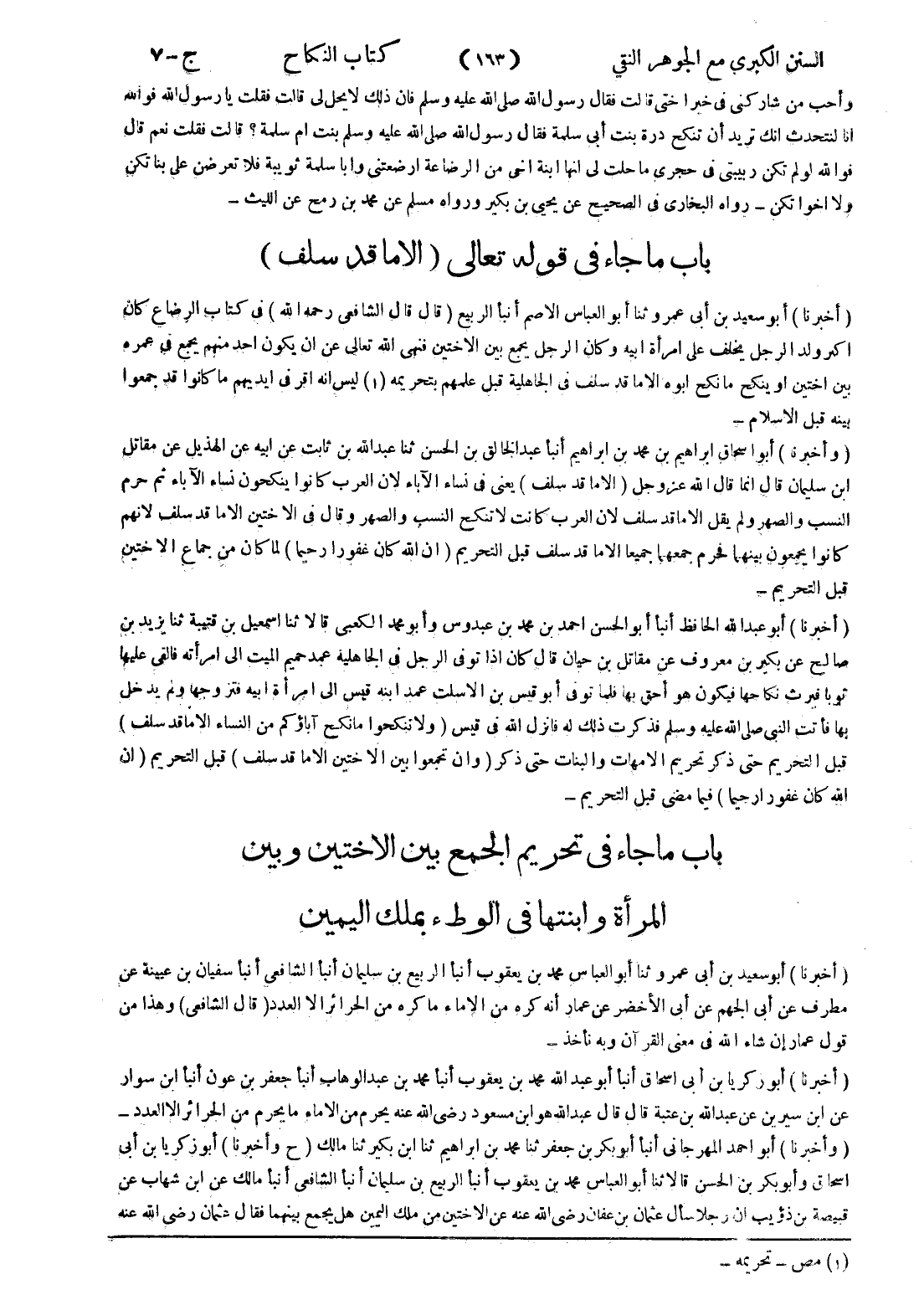 (أخبرنا) أبو سعيد بن أبى عمرو ثنا أبو العباس الاصم أنبأ الربيع (قال قال الشافعي رحمه الله) في كتاب الرضاع كان اكبر ولد الرجل يخلف على امرأة ابيه وكان الرجل يجمع بين الاختين فنهى الله تعالى عن ان يكون احد منهم يجمع في عمره بين اختين أو ينكح ما نكح ابوه الا ما قد سلف في الجاهلية قبل علمهم بتحريمه (1) ليس انه اقر في ايديهم ما كانوا قد جمعوا بينه قبل الاسلام