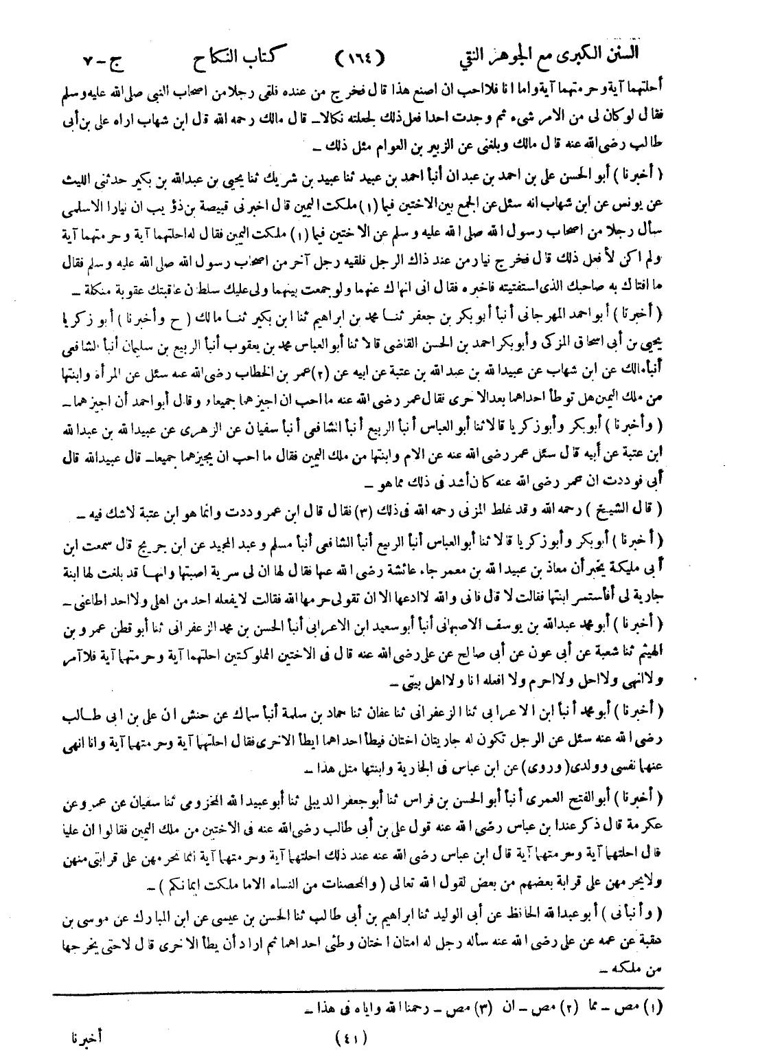 - (أخبرنا) أبو الحسن على بن احمد بن عبدان أنبأ احمد بن عبيد ثنا عبيد بن شريك ثنا يحيى بن عبد الله بن بكير حدثنى الليث عن يونس عن ابن شهاب انه سئل عن الجمع بين الاختين فيما (1) ملكت اليمين قال اخبرني قبيصة بن ذؤيب ان نيارا الاسلمي سأل رجلا من اصحاب رسول الله صلى الله عليه وسلم عن الاختين فيما (1) ملكت اليمين فقال له احلتهما آية وحرمتهما آية ولم اكن لافعل ذلك قال فخرج نيار من عند ذاك الرجل فلقيه رجل آخر من اصحاب رسول الله صلى الله عليه وسلم فقال ما افتاك به صاحبك الذى استفتيته فاخبره فقال انى انهاك عنهما ولو جمعت بينهما ولى عليك سلطان عاقبتك عقوبة منكلة