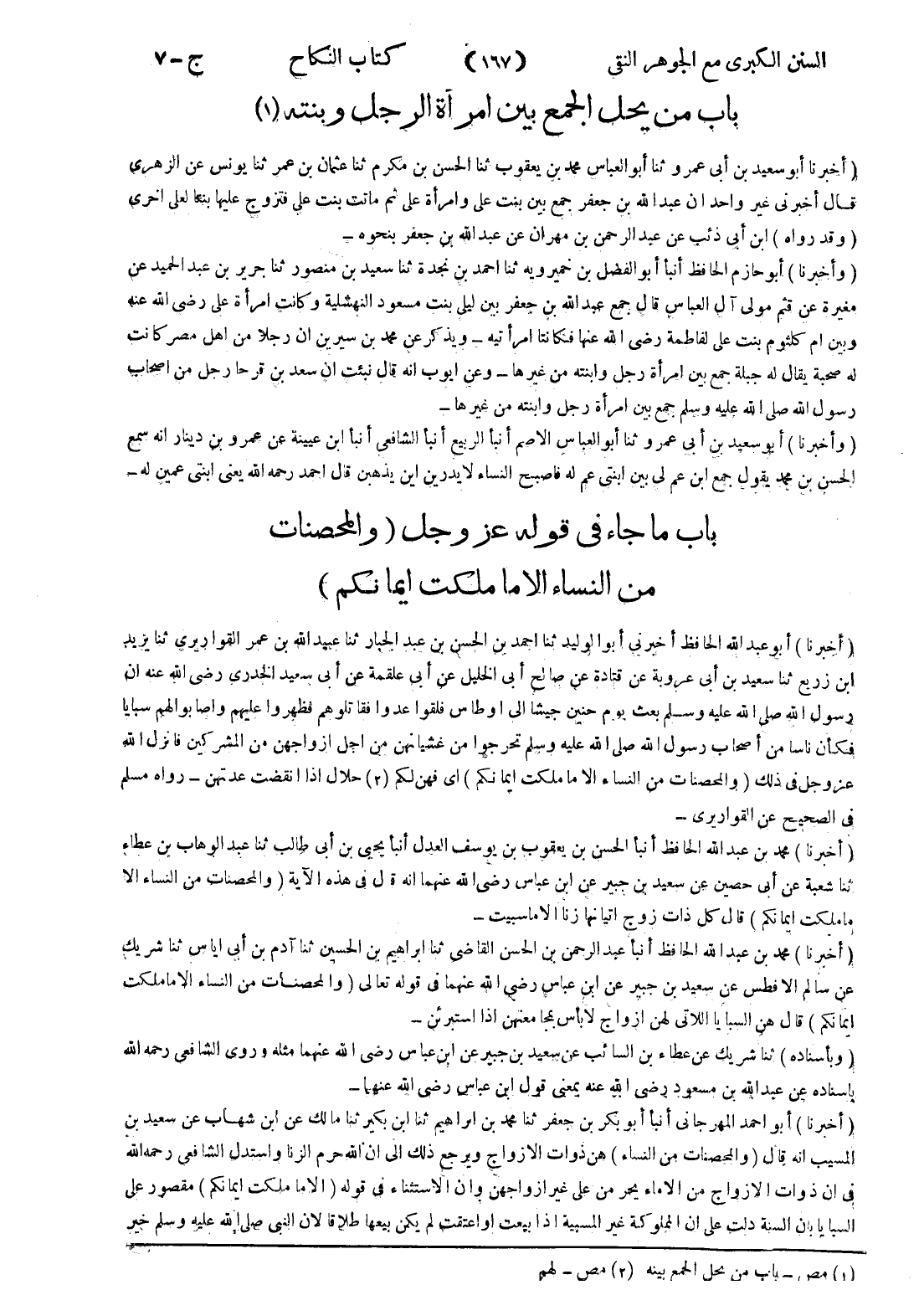 - (وأخبرنا) أبو حازم الحافظ أنبأ أبو الفضل بن خميرويه ثنا احمد بن نجدة ثنا سعيد بن منصور ثنا جرير بن عبد الحميد عن مغيرة عن قثم مولى آل العباس قال جمع عبد الله بن جعفر بين ليلى بنت مسعود النهشلية وكانت امرأة على رضى الله عنه وبين ام كلثوم بنت على لفاطمة رضى الله عنها فكانتا امرأتيه - ويذكر عن محمد بن سيرين ان رجلا من اهل مصر كانت له صحبة يقال له جبلة جمع بين امرأة رجل وابنته من غيرها - وعن ايوب انه قال نبئت ان سعد بن قرحا رجل من اصحاب رسول الله صلى الله عليه وسلم جمع بين امرأة رجل وابنته من غيرها