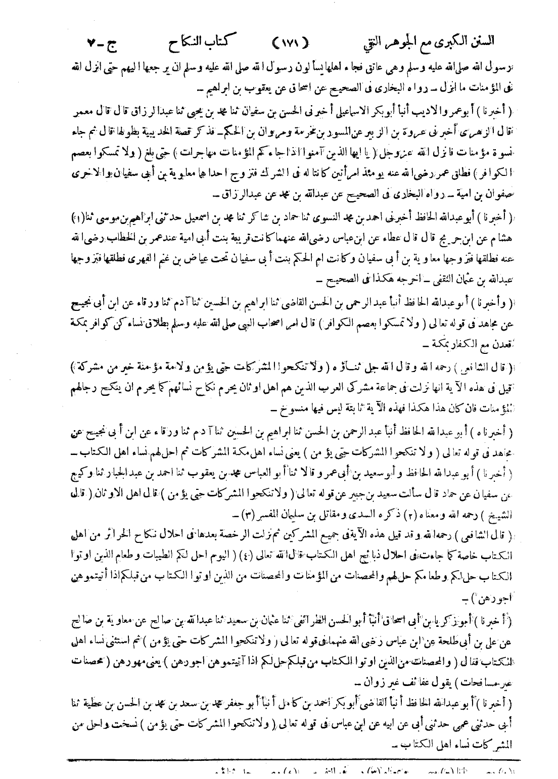 - (أخبرنا) أبو عبد الله الحافظ أنبأ القاضى أبو بكر احمد بن كامل أنبأ أبو جعفر محمد بن سعد بن محمد بن الحسن بن عطية ثنا أبى حدثنى عمى حدثنى أبى عن ابيه عن ابن عباس في قوله تعالى (ولا تنكحوا المشركات حتى يؤمن) نسخت واحل من المشركات نساء اهل الكتاب -