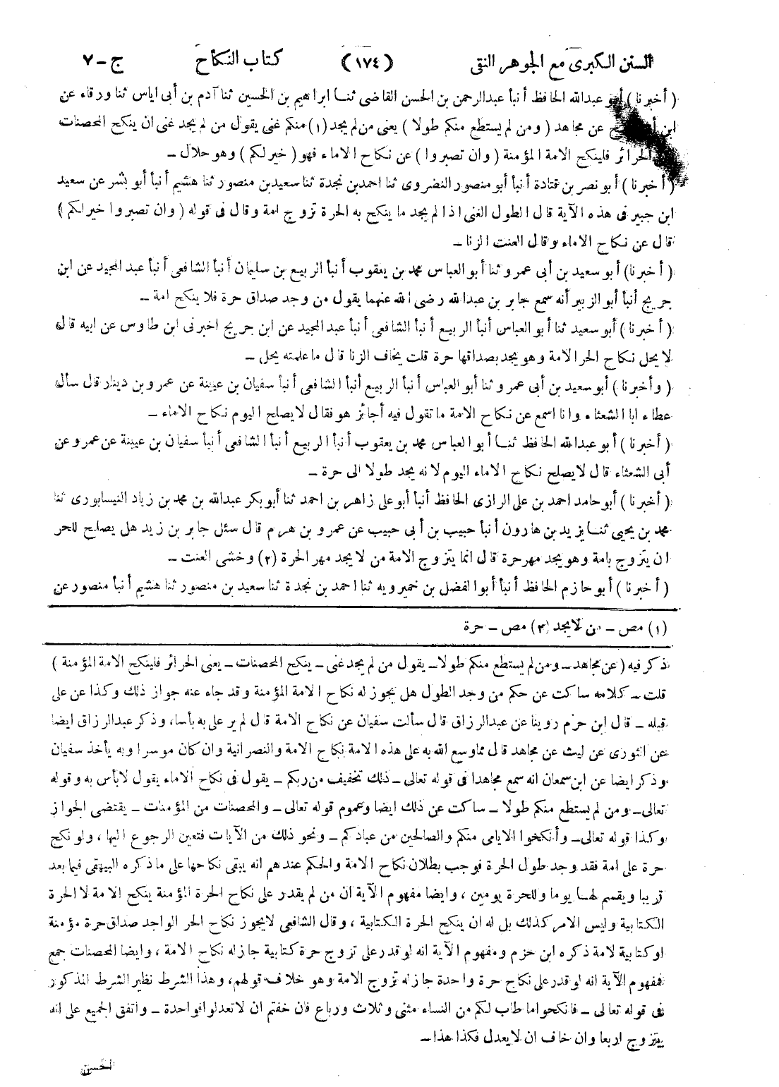 ذكر فيه (عن مجاهد - ومن لم يستطع منكم طولا - يقول من لم يجد عنى - ينكح المحصنات - يعنى الحرائر فلينكح الامة المؤمنة) قلت - كلامه ساكت عن حكم من وجد الطول هل يجوز له نكاح الامة المؤمنة وقد جاء عنه جواز ذلك وكذا عن على قبله - قال ابن حزم روينا عن عبد الرزاق قال سألت سفيان عن نكاح الامة قال لم ير على به بأسا، وذكر عبد الرزاق ايضا عن الثوري عن ليث عن مجاهد قال مما وسع الله به على هذه الامة نكاح الامة والنصرانية وان كان موسرا وبه يأخذ سفيان وذكر ايضا عن ابن سمعان انه سمع مجاهدا في قوله تعالى - ذلك تخفيف من ربكم - يقول في نكاح الا ماء يقول لا بأس به وقوله تعالى - ومن لم يستطع منكم طولا - ساكت عن ذلك ايضا وعموم قوله تعالى - والمحصنات من المؤمنات - يقتضى الجواز وكذا قوله تعالى - وأنكحوا الايامى منكم والصالحين من عبادكم - ونحو ذلك من الآيات فتعين الرجوع إليها، ولو نكح حرة على امة فقد وجد طول الحرة فوجب بطلان نكاح الامة والحكم عندهم انه يبقى نكاحها على ما ذكره البيهقى فيما بعد قريبا ويقسم لها يوما وللحرة يومين، وايضا مفهوم الآية ان من لم يقدر على نكاح الحرة المؤمنة ينكح الامة لا الحرة الكتابية وليس الامر كذلك بل له ان ينكح الحرة الكتابية، وقال الشافعي لا يجوز نكاح الحر الواجد صداق حرة مؤمنة أو كتابية لامة ذكره ابن حزم ومفهوم الآية انه لو قدر على تزوج حرة كتابية جاز له نكاح الامة، وايضا المحصنات جمع فمفهوم الآية انه لو قدر على نكاح حرة واحدة جاز له تزوج الامة وهو خلاف قولهم، وهذا الشرط نظير الشرط المذكور في قوله تعالى - فانكحوا ما طاب لكم من النساء مثنى وثلاث ورباع فان خفتم ان لا تعدلوا فواحدة - واتفق الجميع على انه يتزوج اربعا وان خاف ان لا يعدل فكذا هذا -