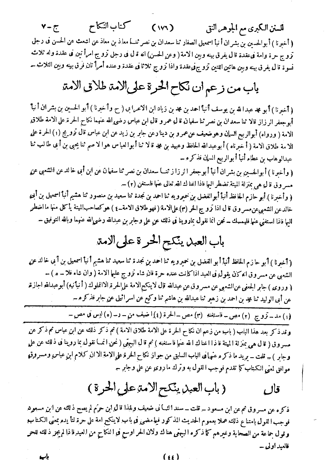 وقد ذكر بعد هذا الباب (باب من زعم ان نكاح الحرة على الامة طلاق الامة) ثم ذكر ذلك عن ابن عباس ثم ذكر عن مسروق (قال هي بمنزلة الميتة فإذا اغناك الله عنها فاستغنه) ثم قال البيهقى (نحن انما نقول بما روينا في ذلك عن على وجابر) - قلت - يريد ما ذكره عنهما في الباب السابق من جواز نكاح الحرة على الامة الا ان كلام ابن عباس ومسروق موافق لمعنى الكتاب كما تقدم فوجب القول به وترك ما روى عن على وجابر - قال (باب العبد ينكح الامة على الحرة) ذكره عن مسروق ثم عن ابن مسعود - قلت - سند الثاني ضعيف ولهذا قال ابن حزم لم يصح ذلك عن ابن مسعود فوجب القول بامتناع ذلك عملا بعموم الحديث المذكور فيما مضى في باب لا ينكح امة على حرة لتأيده بمعنى الكتاب وقول جماعة من الصحابة وغيرهم كما ذكره البيهقى هناك ولان الحر اوسع في النكاح من العبد فإذا لم يجز ذلك للحر فالعبد اولى -