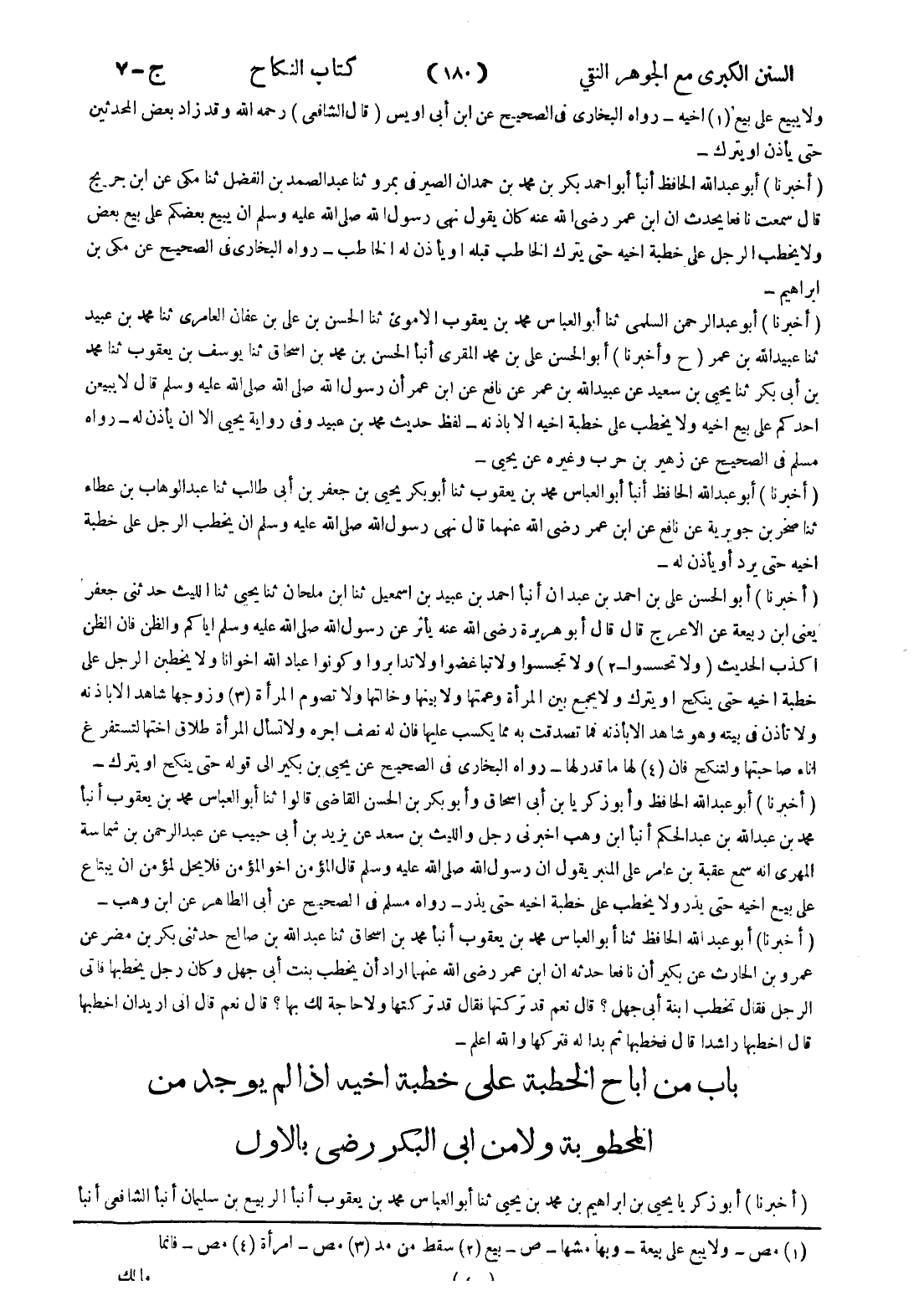 (ح وأخبرنا) أبو الحسن على بن محمد المقرى أنبأ الحسن بن محمد بن اسحاق ثنا يوسف بن يعقوب ثنا محمد بن أبى بكر ثنا يحيى بن سعيد عن عبيدالله بن عمر عن نافع عن ابن عمر أن رسول الله صلى الله عليه وسلم قال لا يبيعن احدكم على بيع اخيه ولا يخطب على خطبة اخيه الا باذنه - لفظ حديث محمد بن عبيد وفي رواية يحيى الا ان يأذن له - رواه مسلم في الصحيح عن زهير بن حرب وغيره عن يحيى