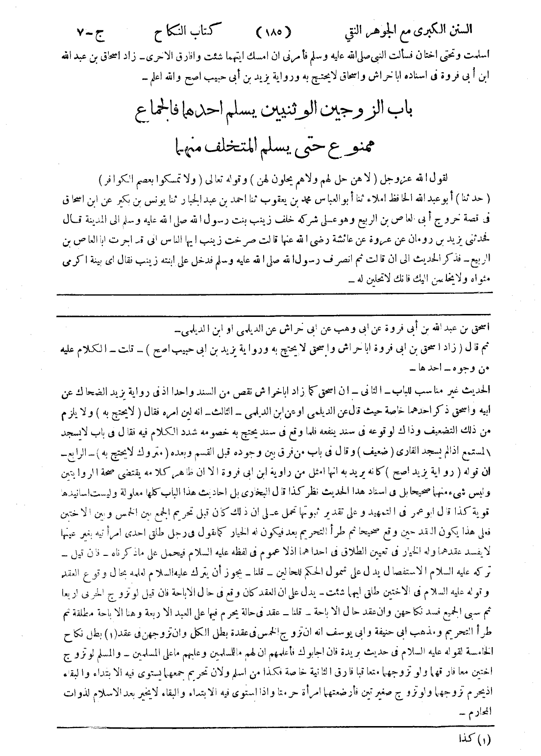 اسحق بن عبد الله بن أبى فروة عن ابى وهب عن ابى خراش عن الديلمى أو ابن الديلمى - ثم قال (زاد اسحق بن ابى فروة ابا حراش واسحق لا يحتج به ورواية يزيد بن ابى حبيب اصح) - قلت - الكلام عليه من وجوه - احدها - الحديث غير مناسب للباب - الثاني - ان اسحق كما زاد ابا خراش نقص من السند واحدا إذ في رواية يزيد الضحاك عن ابيه واسحق ذكر احدهما خاصة حيث قال عن الديلمى أو عن ابن الديلمى - الثالث - انه لين امره فقال (لا يحتج به) ولا يلزم من ذلك التضعيف وذاك لوقوعه في سند ينفعه فلما وقع في سند يحتج به خصومه شدد الكلام فيه فقال في باب لا يسجد المستمع إذا لم يسجد القارى (ضعيف) وقال في باب من فرق بين وجوده قبل القسم وبعده (متروك لا يحتج به) - الرابع - ان قوله (رواية يزيد اصح) كانه يريد به انها امثل من رواية ابن ابى فروة الا ان ظاهر كلامه يقتضى صحة الروايتين وليس شئ منهما صحيحا بل في اسناد هذا الحديث نظر كذا قال البخاري بل احاديث هذا الباب كلها معلولة وليست اسانيدها قوية كذا قال أبو عمر في التمهيد وعلى تقدير ثبوتها تحمل على ان ذلك كان قبل تحريم الجمع بين الخمس وبين الاختين فعلى هذا يكون البقد حين وقع صحيحا ثم طرأ التحريم بعد فيكون له الخيار كما يقول في رجل طلق احدى امرأتيه بغير عينها لا يفسد عقدهما وله الخيار في تعيين الطلاق في احداهما إذ لا عموم في لفظه عليه السلام فيحمل على ما ذكرناه - فان قيل - تركه عليه السلام الاستفصال يدل على شمول الحكم للحالين - قلنا - يجوز أن يترك عليه السلام لعلمه بحال وقوع العقد وقوله عليه السلام في الاختين طلق ايهما شئت - يدل على ان العقد كان وقع في حال الاباحة فان قيل لو تزوج الحربى اربعا ثم سبى الجميع فسد نكاحهن وان عقد حال الاباحة - قلنا - عقد في حالة يحرم فيها على العبد الا ربعة وهنا الاباحة مطلقة ثم طرأ التحريم ومذهب ابى حنيفة وابى يوسف انه ان تزوج الخمس في عقدة بطل الكل وان تزوجهن في عقد (1) بطل نكاح الخامسة لقوله عليه السلام في حديث بريدة فان اجابوك فأعلمهم ان لهم ما للمسلمين وعليهم ما على المسلمين - والمسلم لو تزوج اختين معا فارقهما ولو تزوجهما متعاقبا فارق الثانية خاصة فكذا من اسلم ولان تحريم جمعهما يستوى فيه الابتداء والبقاء إذ يحرم تزوجهما ولو تزوج صغيرتين فأرضعتهما امرأة حرمتا وإذا استوى فيه الابتداء والبقاء لا يخير بعد الاسلام لذوات المحارم -