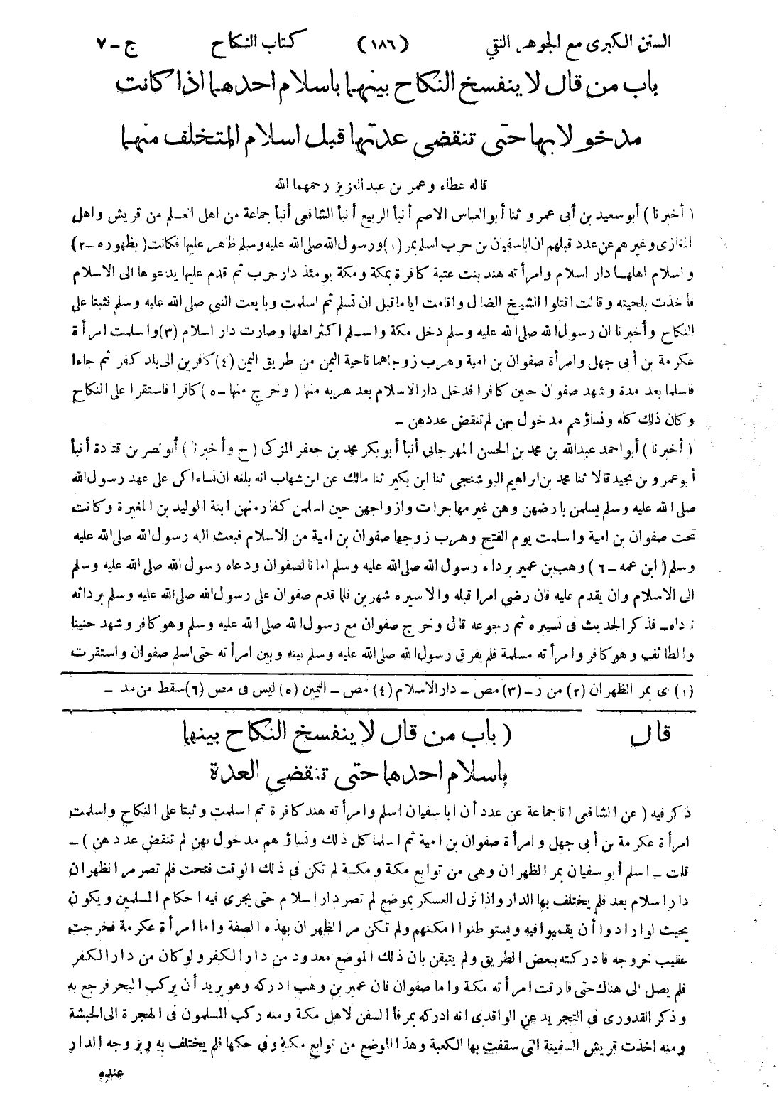 قال (باب من قال لا ينفسخ النكاح بينهما باسلام احدهما حتى تنقضي العدة ذكر فيه (عن الشافعي انا جماعة عن عدد أن ابا سفيان اسلم وامرأته هند كافرة ثم اسلمت وثبتا على النكاح واسلمت امرأة عكرمة بن أبى جهل وامرأة صفوان بن امية ثم اسلما كل ذلك ونساؤهم مدخول بهن لم تنقض عددهن) - قلت - اسلم أبو سفيان بمر الظهران وهى من توابع مكة ومكة لم تكن في ذلك الوقت فتحت فلم تصرمر الظهران دار اسلام بعد فلم يختلف بها الدار وإذا نزل العسكر بموضع لم تصر دار اسلام حتى يجرى فيه احكام المسلمين ويكون بحيث لو ارادوا أن يقيموا فيه ويستوطنوا امكنهم ولم تكن مر الظهران بهذه الصفة واما امرأة عكرمة فخرجت عقيب خروجه فادركته ببعض الطريق ولم يتيقن بان ذلك الموضع معدود من دار الكفر ولو كان من دار الكفر فلم يصل إلى هناك حتى فارقت امرأته مكة واما صفوان فان عمير بن وهب ادركه وهو يريد أن يركب البحر فرجع به وذكر القدورى في التجريد عن الواقدي انه ادركه بمرفأ السفن لاهل مكة ومنه ركب المسلمون في الهجرة إلى الحبشة ومنه اخذت قريش السفينة التى سقفت بها الكعبة وهذا الموضع من توابع مكة وفي حكمها فلم يختلف به وبزوجه الدار