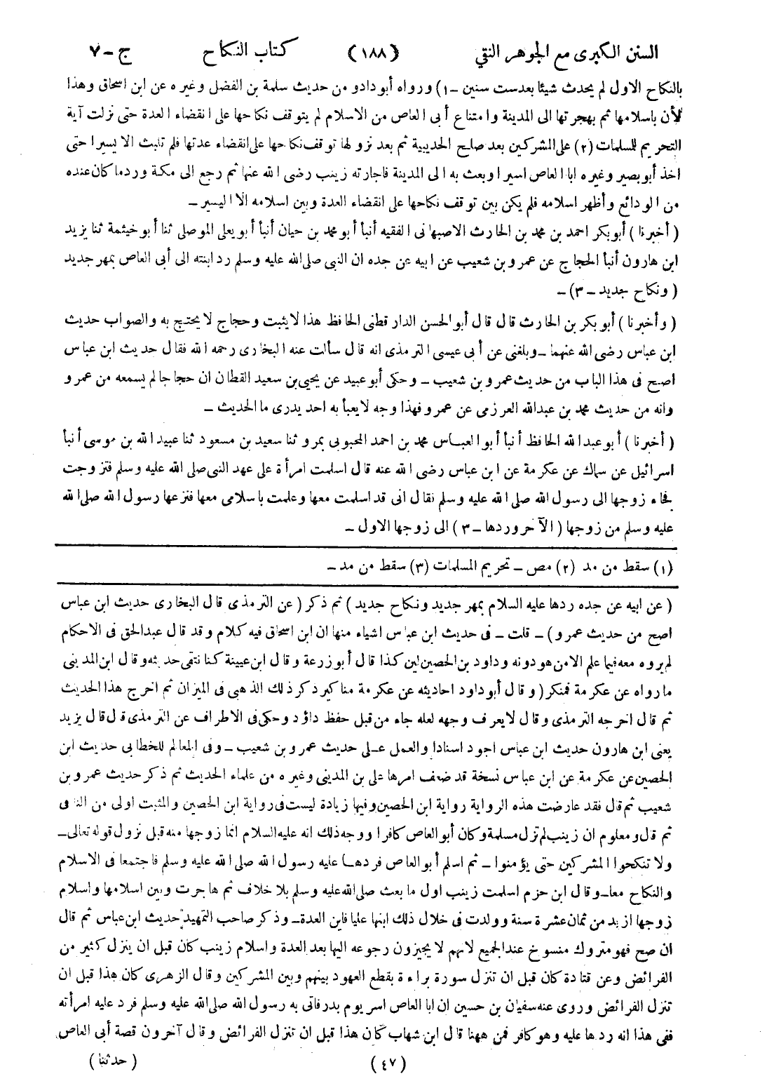 (عن ابيه عن جده ردها عليه السلام بمهر جديد ونكاح جديد) ثم ذكر (عن الترمذي قال البخاري حديث ابن عباس اصح من حديث عمرو) - قلت - في حديث ابن عباس اشياء منها ان ابن اسحاق فيه كلام وقد قال عبد الحق في الاحكام لم يروه معه فيما علم الا من هو دونه وداود بن الحصين لين كذا قال أبو زرعة وقال ابن عيينة كنا نتقى حديثه وقال ابن المدينى ما رواه عن عكرمة فمنكر (وقال أبو داود احاديثه عن عكرمة مناكير ذكر ذلك الذهبي في الميزان ثم اخرج هذا الحديث ثم قال اخرجه الترمذي وقال لا يعرف وجهه لعله جاء من قبل حفظ داؤد وحكى في الاطراف عن الترمذي قال قال يزيد يعنى ابن هارون حديث ابن عباس اجود اسنادا والعمل على حديث عمرو بن شعيب - وفى المعالم للخطابي حديث ابن الحصين عن عكرمة عن ابن عباس نسخة قد ضعف امرها على بن المدينى وغيره من علماء الحديث ثم ذكر حديث عمرو بن شعيب ثم قال فقد عارضت هذه الرواية رواية ابن الحصين وفيها زيادة ليست في رواية ابن الحصين والمثبت اولى من النافي ثم قال ومعلوم ان زينب لم تزل مسلمة وكان أبو العاص كافرا ووجه ذلك انه عليه السلام انما زوجها منه قبل نزول قوله تعالى - ولا تنكحوا المشكرين حتى يؤمنوا - ثم اسلم أبو العاص فردها عليه رسول الله صلى الله عليه وسلم فاجتمعا في الاسلام والنكاح معا - وقال ابن حزم اسلمت زينب اول؟ بعث صلى الله عليه وسلم بلا خلاف ثم هاجرت وبين اسلامها واسلام زوجها ازيد من ثمان عشرة سنة وولدت في خلال ذلك ابنها عليا فاين العدة - وذكر صاحب التمهيد حديث ابن عباس ثم قال ان صح فهو متروك منسوخ عند الجميع لانهم لا يجيزون رجوعه إليها بعد العدة واسلام زينب كان قبل ان ينزل كثير من الفرائض وعن قتادة كان قبل ان تنزل سورة براءة بقطع العهود بينهم وبين المشركين وقال الزهري كان هذا قبل ان تنزل الفرائض وروى عنه سفيان بن حسين ان ابا العاص اسر يوم بدر فاتى به رسول الله صلى الله عليه وسلم فرد عليه امرأته ففى هذا انه ردها عليه وهو كافر فمن ههنا قال ابن شهاب كان هذا قبل ان تنزل الفرائض وقال آخرون قصة أبى العاص