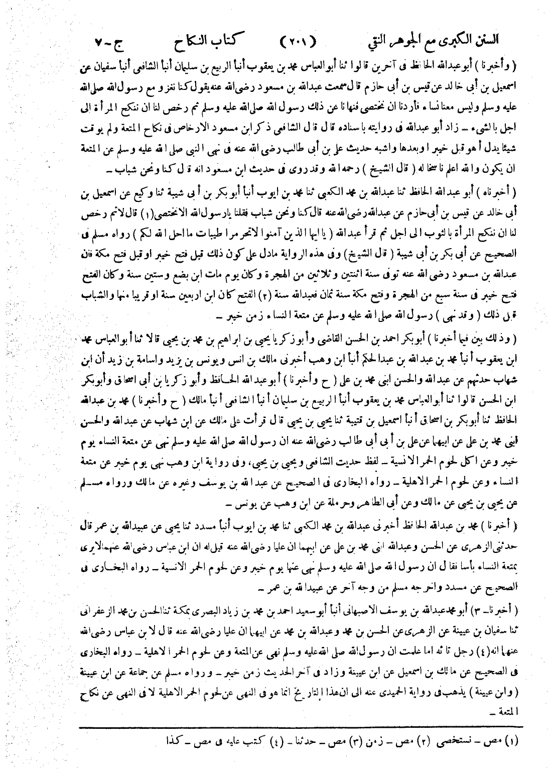 - (أخبرنا) محمد بن عبد الله الحافظ أخبرني عبد الله بن محمد الكعبي ثنا محمد بن ايوب أنبأ مسدد ثنا يحيى عن عبيدالله بن عمر قال حدثنى الزهري عن الحسن و عبد الله ابني محمد بن على عن ابيهما ان عليا رضى الله عنه قيل له ان ابن عباس رضى الله عنهما لا يرى بمتعة النساء بأسا فقال ان رسول الله صلى الله عليه وسلم نهى عنها يوم خيبر وعن لحوم الحمر الانسية - رواه البخاري في الصحيح عن مسدد واخرجه مسلم من وجه آخر عن عبيدالله بن عمر - (أخبرنا - 3) أبو محمد عبد الله بن يوسف الاصبهاني أنبأ أبو سعيد احمد بن محمد بن زياد البصري بمكة ثنا الحسن بن محمد الزعفراني ثنا سفيان بن عيينة عن الزهري عن الحسن بن محمد و عبد الله بن محمد عن ابيهما ان عليا رضى الله عنه قال لابن عباس رضى الله عنهما انه (4) رجل تائه اما علمت ان رسول الله صلى الله عليه وسلم نهى عن المتعة وعن لحوم الحمر الاهلية - رواه البخاري في الصحيح عن مالك بن اسمعيل عن ابن عيينة وزاد في آخر الحديث زمن خيبر - ورواه مسلم عن جماعة عن ابن عيينة (وابن عيينة) يذهب في رواية الحميدى عنه إلى ان هذا التاريخ انما هو في النهى عن لحوم الحمر الاهلية لا في النهى عن نكاح المتعة -