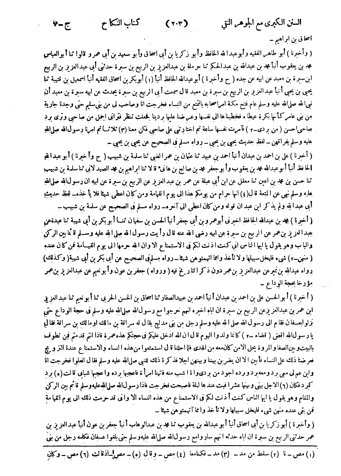 - (أخبرنا) محمد بن عبد الله الحافظ اخبرني أبو عمرو بن أبى جعفر أنبأ الحسن بن سفيان ثنا أبو بكر بن أبى شيبة ثنا عبدة عن عبد العزيز بن عمر عن الربيع بن سبرة عن ابيه رضى الله عنه قال رأيت رسول الله صلى الله عليه وسلم قائما بين الركن والباب وهو يقول يا ايها الناس انى كنت اذنت لكم في الاستمتاع الا وان الله حرمها إلى يوم القيامة فمن كان عنده (منهن - 2) شئ فليخل سبيلها ولا تأخذ وامما اتيمتوهن شيئا - رواه مسلم في الصحيح عن أبى بكر بن أبى شيبة (وكذلك) رواه عبد الله بن نمير عن عبد العزيز بن عمر دون ذكر التاريخ فيه (ورواه) جعفر بن عون وأبو نعيم عن عبد العزيز بن عمر مؤرخا بحجة الوداع