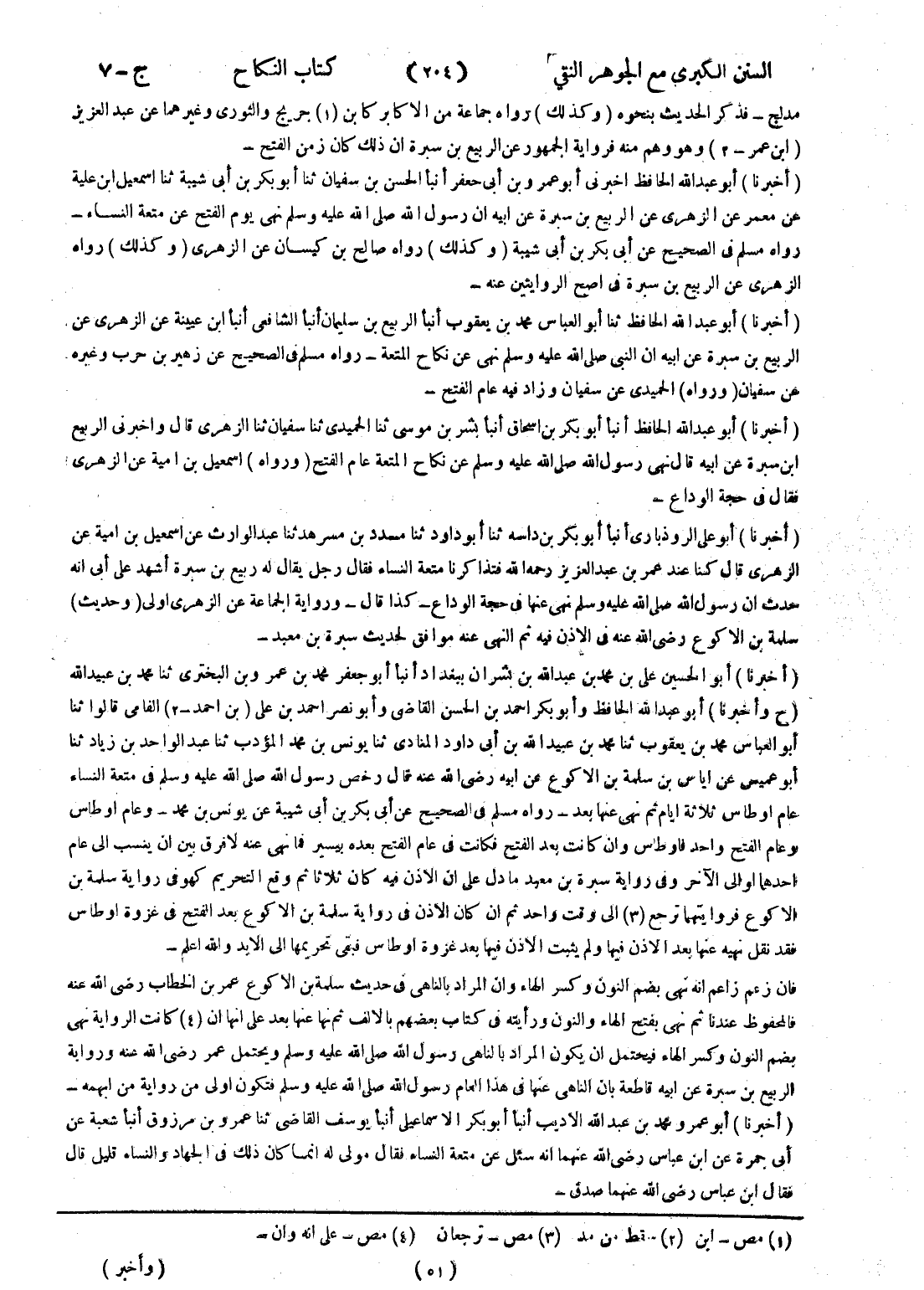 - (أخبرنا) أبو عبد الله الحافظ اخبرني أبو عمرو بن أبى جعفر أنبأ الحسن بن سفيان ثنا أبو بكر بن أبى شيبة ثنا اسمعيل ابن علية عن معمر عن الزهري عن الربيع بن سبرة عن ابيه ان رسول الله صلى الله عليه وسلم نهى يوم الفتح عن متعة النساء - رواه مسلم في الصحيح عن أبى بكر بن أبى شيبة (وكذلك) رواه صالح بن كيسان عن الزهري (وكذلك) رواه الزهري عن الربيع بن سبرة في اصح الروايتين عنه