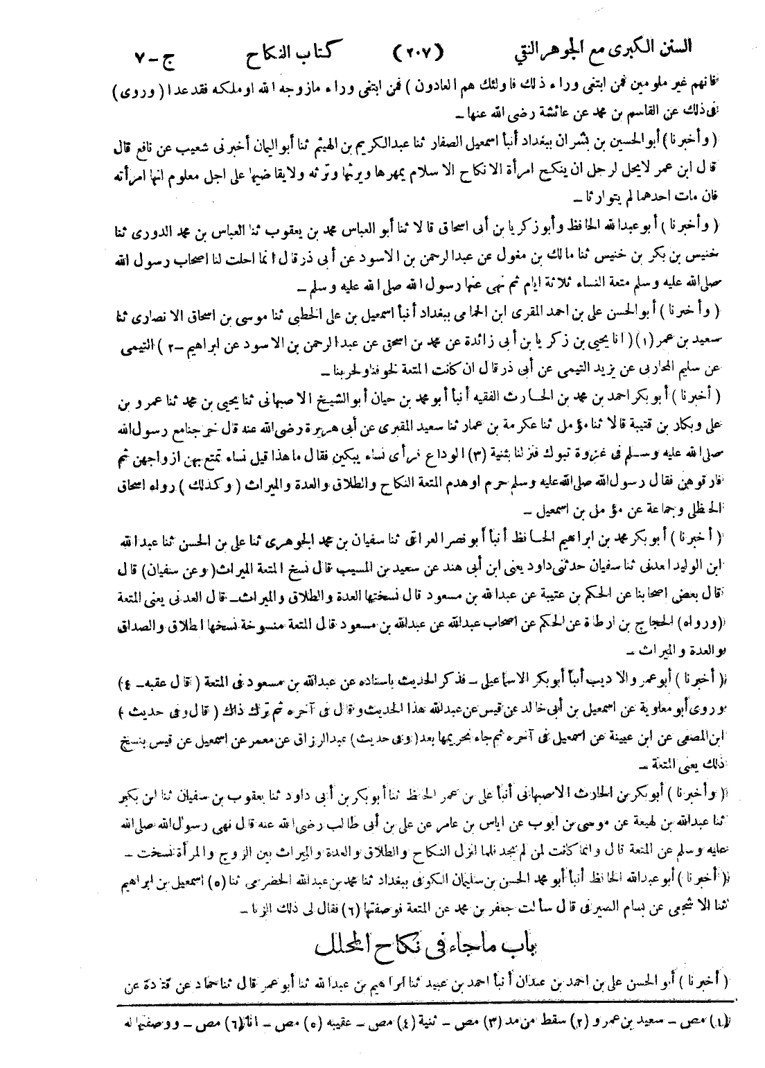 - (أخبرنا) أبو بكر محمد بن ابراهيم الحافظ أنبأ أبو نصر العراقى ثنا سفيان بن محمد الجوهرى ثنا على بن الحسن ثنا عبد الله ابن الوليد العدنى ثنا سفيان حدثنى داود يعنى ابن أبى هند عن سعيد بن المسيب قال نسخ المتعة الميراث (وعن سفيان) قال قال بعض اصحابنا عن الحكم بن عتيبة عن عبد الله بن مسعود قال نسختها العدة والطلاق والميراث - قال العدنى يعنى المتعة (ورواه) الحجاج بن ارطاة عن الحكم عن اصحاب عبد الله عن عبد الله بن مسعود قال المتعة منسوخة نسخها الطلاق والصداق والعدة والميراث