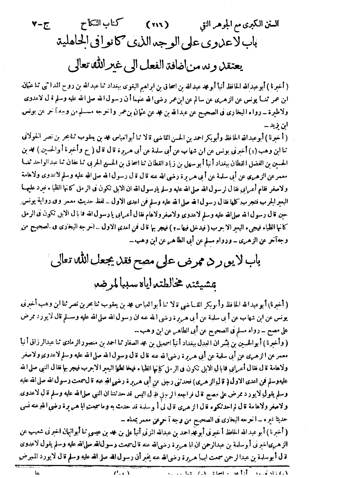 (أخبرنا) أبو عبد الله الحافظ أنبأ أبو محمد عبد الله بن اسحاق بن ابراهيم البغوي ببغداد ثنا عبد الله بن روح المدائني ثنا عثمان ابن عمر ثنا يونس عن الزهري عن سالم عن ابن عمر رضى الله عنهما أن رسول الله صلى الله عليه وسلم قال لا عدوى ولا طيرة - رواه البخاري في الصحيح عن عبد الله بن محمد عن عثمان بن عمر واخرجه مسلم من وجه آخر عن يونس ابن يزيد