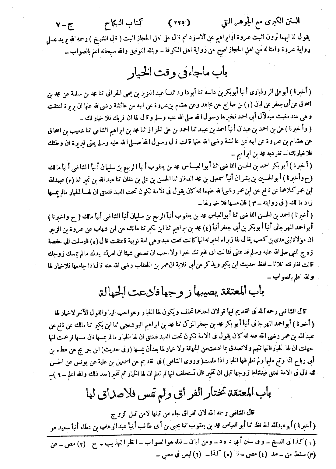 - (أخبرنا) احمد بن الحسن القاضى ثنا أبو العباس محمد بن يعقوب أنبأ الربيع بن سليمان أنبأ الشافعي أنبأ مالك (ح واخبرنا) أبو أحمد المهرجانى أنبأ أبو بكر بن أبى جعفر أنبأ (4) محمد بن ابراهيم ثنا ابن بكير ثنا مالك عن ابن شهاب عن عروة بن الزبير ان مولاة لبنى عدى بن كعب يقال لها زبراء اخبرته انها كانت تحت عبد وهى امة نوبية فاعتقت قال (5) فارسلت إلى حفصة زوج النبي صلى الله عليه وسلم فدعتنى فقالت انى مخبرتك خبرا ولا احب ان تصنعي شيئا ان امرك بيدك ما لم يمسك زوجك قالت ففارقته ثلاثا - لفظ حديث ابن بكير ويذكر عن ابى قلابة ان عمر بن الخطاب رضى الله عنه قال إذا جامعها فلا خيار لها والله اعلم بالصواب - باب المعتقة يصيبها زوجها فادعت الجهالة قال الشافعي رحمه الله في القديم فيها قولان احدهما تحلف ويكون لها الخيار وهو احب الينا والقول الاخر لا خيار لها