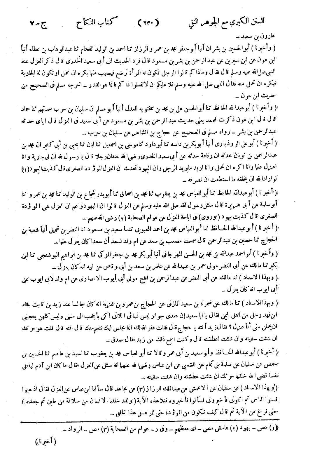 - (وأخبرنا) أبو احمد عبد الله بن محمد بن الحسن المهرجانى أنبأ أبو بكر محمد بن جعفر المزكى ثنا محمد بن ابراهيم البوشنجى ثنا ابن بكير ثنا مالك عن أبى النضر مولى عمر بن عبيدالله عن عامر بن سعد بن أبى وقاص عن ابيه انه كان يعزل - (وبهذا الاسناد) ثنا مالك عن أبى النضر عن عبد الرحمن بن افلح مولى أبى أيوب الانصاري عن ام ولد لابي ايوب عن أبى ايوب انه كان يعزل - (وبهذا الاسناد) ثنا مالك عن ضمرة بن سعيد المازنى عن الحجاج بن عمرو بن غزية انه كان جالسا عند زيد بن ثابت فجاء ابن فهد رجل من اهل اليمين فقال يا ابا سعيد إن عندي جوار ليس نسائى اللاتى اكن بأعجب إلى منهن وليس كلهن يعجبنى ان يحملن منى أفأعزل ؟ فقال زيد أفته يا حجاج قال فقلت غفر الله لك انما نجلس اليك نتعلم منك قال افته قال قلت هو حرثك ان شئت سقيته وان شئت اعطشته قال وكنت اسمع ذلك من زيد فقال صدق