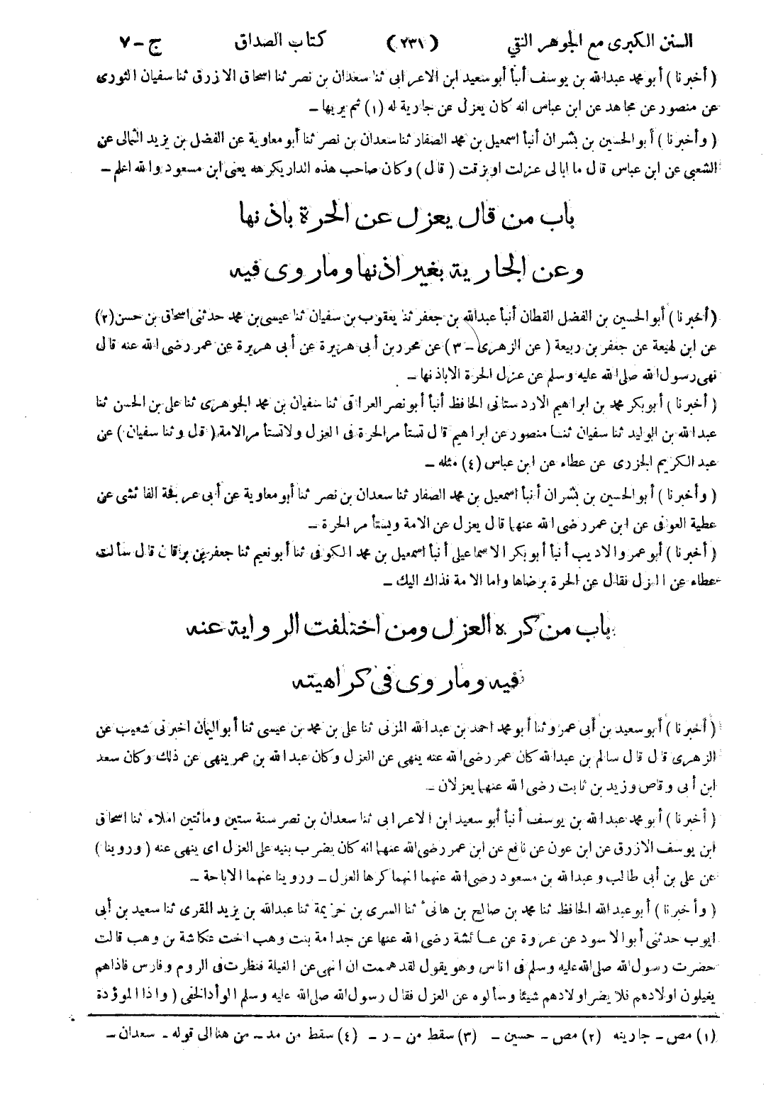 - (وأخبرنا) أبو الحسين بن بشران أنبأ اسمعيل بن محمد الصفار ثنا سعدان بن نصر ثنا أبو معاوية عن ابى عرفجة الفائشى عن عطية العوفى عن ابن عمر رضى الله عنهما قال يعزل عن الامة ويستأمر الحرة
