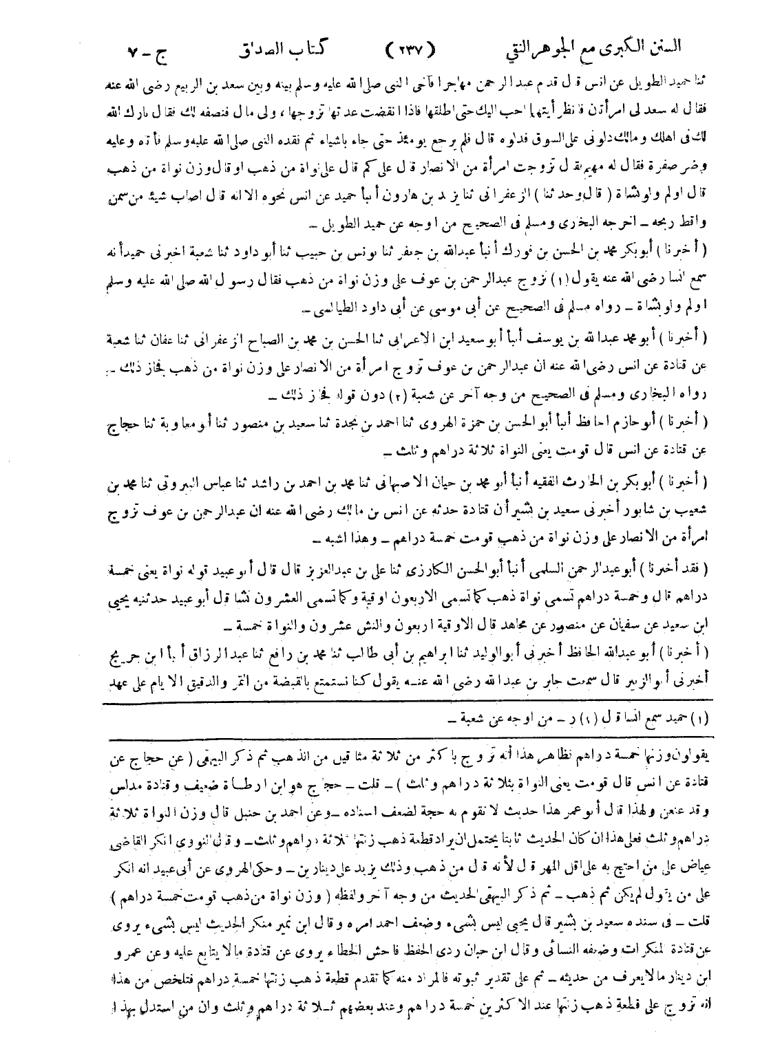 يقولون وزنها خمسة دراهم فظاهر هذا أنه تزوج باكثر من ثلاثة مثاقيل من الذهب ثم ذكر البيهقى (عن حجاج عن قتادة عن انس قال قومت يعنى النواة بثلاثة دراهم وثلث) - قلت - حجاج هو ابن ارطاة ضعيف وقتادة مدلس وقد عنعن ولهذا قال أبو عمر هذا حديث لا نقوم به حجة لضعف اسناده - وعن احمد بن حنبل قال وزن النواة ثلاثة دراهم وثلث فعلى هذا ان كان الحديث ثابتا يحتمل ان يراد قطعة ذهب زنتها ثلاثة دراهم وثلث - وقال النووي انكر القاضى عياض على من احتج به على اقل المهر قال لانه قال من ذهب وذلك يزيد على دينارين - وحكى الهروي عن أبى عبيد انه انكر على من يقول لم يكن ثم ذهب - ثم ذكر البيهقى الحديث من وجه آخر ولفظه (وزن نواة من ذهب قومت خمسة دراهم) قلت - في سنده سعيد بن بشير قال يحيى ليس بشئ وضعف احمد امره وقال ابن نمير منكر الحديث ليس بشئ يروى عن قتادة لمنكرات وضعفه النسائي وقال ابن حبان ردى الحفظ فاحش الخطاء يروى عن قتادة مالا يتابع عليه وعن عمرو ابن دينار ما لا يعرف من حديثه ثم على تقدير ثبوته فالمراد منه كما تقدم قطعة ذهب زنتها خمسة دراهم فتلخص من هذا انه تزوج على قطعة ذهب زنتها عند الاكثرين خمسة دراهم وعند بعضهم ثلاثة دراهم وثلث وان من استدل بهذا