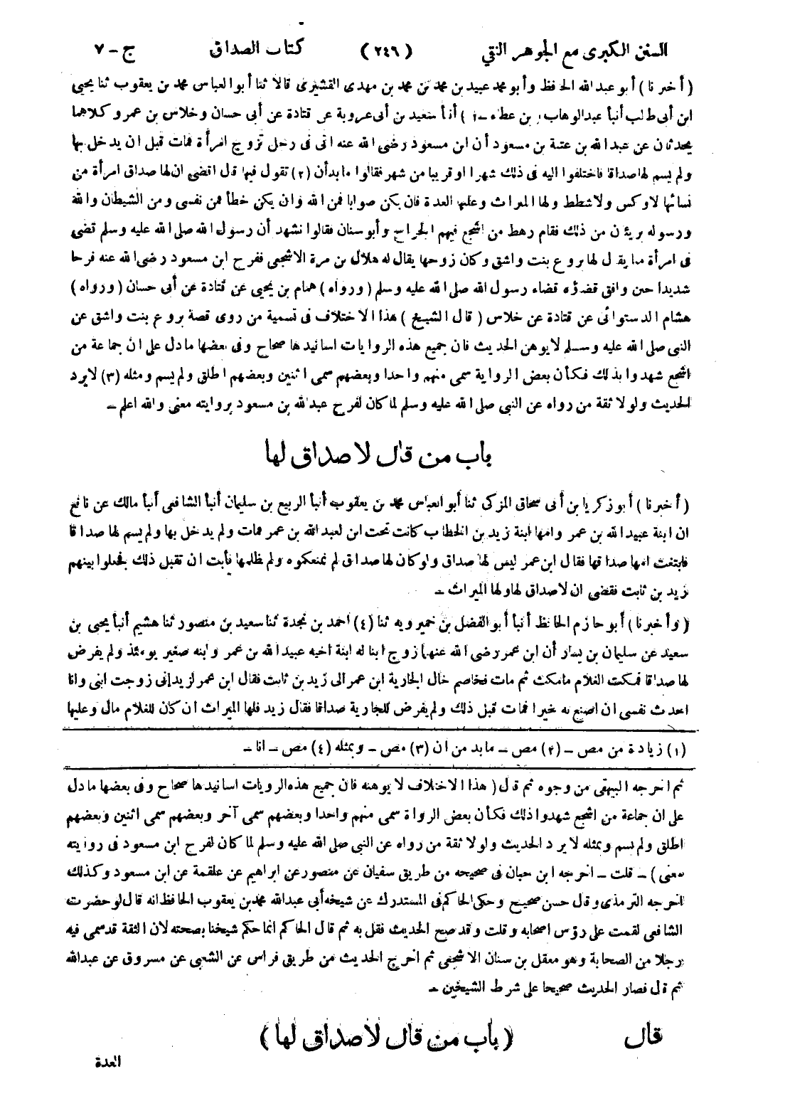 ثم اخرجه البيهقى من وجوه ثم قال (هذا الاختلاف لا يوهنه فان جميع هذه الروايات اسانيدها صحاح وفي بعضها ما دل على ان جماعة من اشجع شهدوا ذلك فكأن بعض الرواة سمى منهم واحدا وبعضهم سمى آخر وبعضهم سمى اثنين وبعضهم اطلق ولم يسم وبمثله لا يرد الحديث ولولا ثقة من رواه عن النبي صلى الله عليه وسلم لما كان لفرح ابن مسعود في روايته معنى) - قلت - اخرجه ابن حبان في صحيحه من طريق سفيان عن منصور عن ابراهيم عن علقمة عن ابن مسعود وكذلك اخرجه الترمذي وقال حسن صحيح وحكى الحاكم في المستدرك عن شيخه أبى عبد الله محمد بن يعقوب الحافظ انه قال لو حضرت الشافعي لقمت على روس اصحابه وقلت وقد صح الحديث فقل به ثم قال الحاكم انما حكم شيخنا بصحته لان الثقة قد سمى فيه رجلا من الصحابة وهو معقل بن سنان الاشجعى ثم اخرج الحديث من طريق فراس عن الشعبى عن مسروق عن عبد الله ثم قال فصار الحديث صحيحا على شرط الشيخين - قال (باب من قال لا صداق لها)