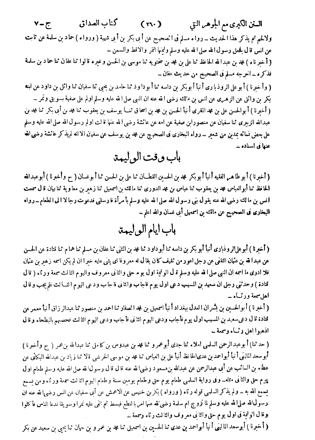 - (وأخبرنا) أبو على الروذبارى أنبأ أبو بكر بن داسه ثنا أبو داود ثنا حامد بن يحيى ثنا سفيان ثنا وائل بن داود عن ابنه بكر بن وائل عن الزهري عن انس بن مالك رضى الله عنه ان النبي صلى الله عليه وسلم اولم على صفية بسويق وتمر