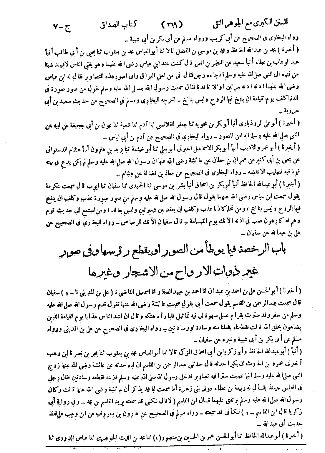 - (أخبرنا) محمد بن عبد الله الحافظ ومحمد بن موسى بن الفضل قالا ثنا أبو العباس محمد بن يعقوب ثنا يحيى بن أبى طالب أنبأ عبد الوهاب بن عطاء أنبأ سعيد عن النضر بن انس قال كنت عند ابن عباس رضى الله عنهما وهو يفتى الناس لا يسند شيئا من فتياه إلى النبي صلى الله عليه وسلم إذ جاءه رجل فقال انى من اهل العراق وانى اصور هذه التصاوير فقال له ابن عباس رضى الله عنهما ادنه ادنه مرتين أو ثلاثا فدنا فقال سمعت رسول الله صلى الله عليه وسلم يقول من صور صورة في الدنيا كلف يوم القيامة ان ينفخ فيها الروح وليس بنافخ - اخرجه البخاري ومسلم في الصحيح من حديث سعيد بن أبى عروبة