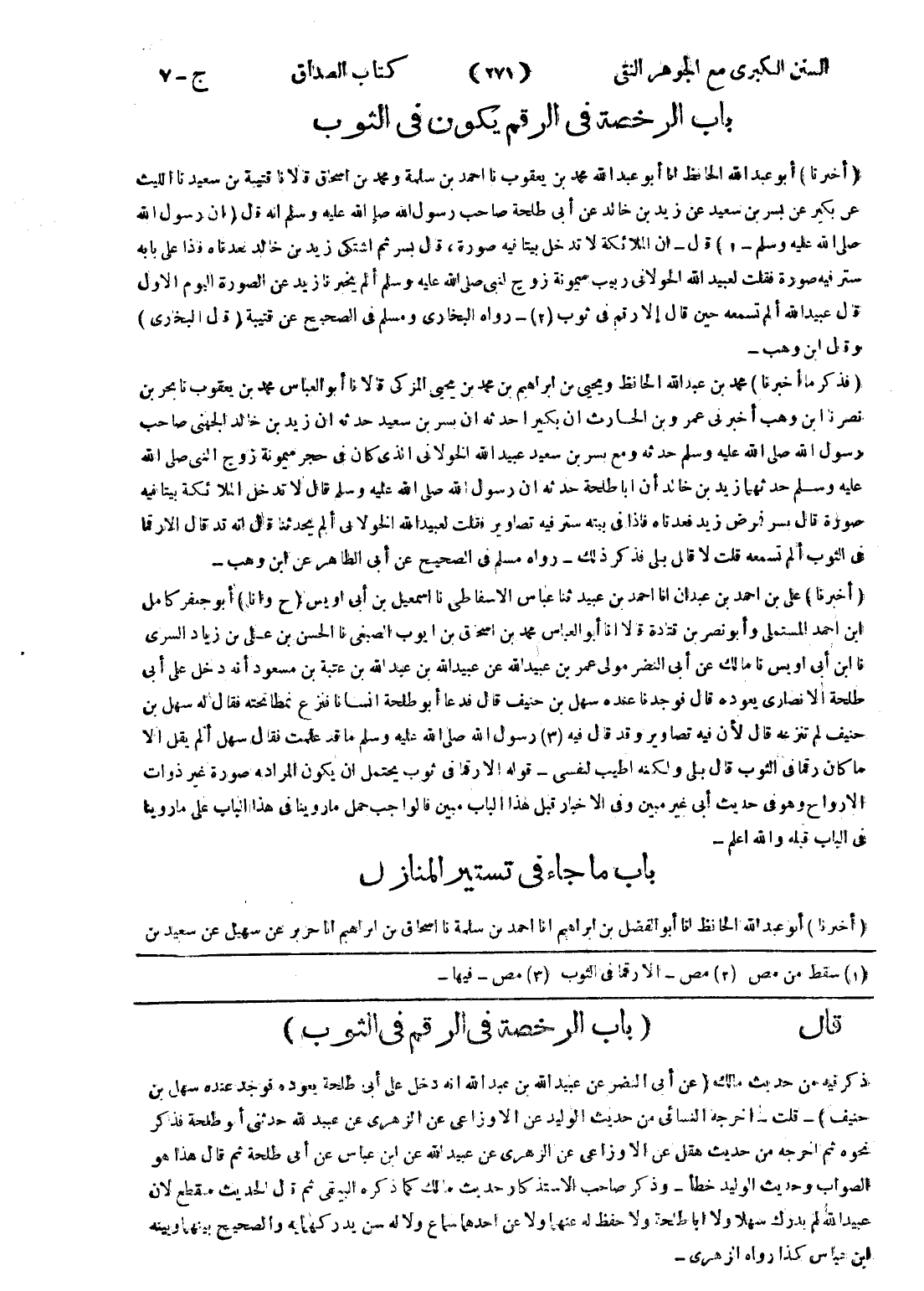 قال (باب الرخصة في الرقم في الثوب) ذكر فيه من حديث مالك (عن أبى النضر عن عبيد الله بن عبد الله انه دخل على أبى طلحة يعوده فوجد عنده سهل بن حنيف) - قلت - اخرجه النسائي من حديث الوليد عن الاوزاعي عن الزهري عن عبيد الله حدثنى أبو طلحة فذكر نحوه ثم اخرجه من حديث هقل عن الاوزاعي عن الزهري عن عبيد الله عن ابن عباس عن أبى طلحة ثم قال هذا هو الصواب وحديث الوليد خطأ - وذكر صاحب الاستذكار حديث مالك كما ذكره البيهقى ثم قال الحديث منقطع لان عبيد الله لم يدرك سهلا ولا ابا طلحة ولا حفظ له عنهما ولا عن احدهما سماع ولا له سن يدركهما به والصحيح بينهما وبينه ابن عباس كذا رواه الزهري -