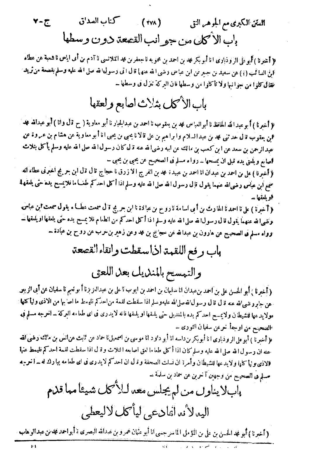 - باب رفع اللقمة إذا سقطت وانقاء القصعة والتمسح بالمنديل بعد اللعق