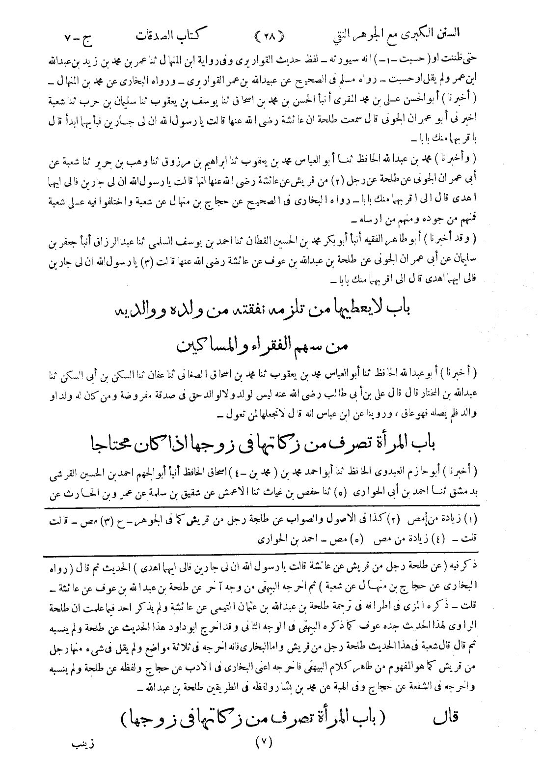 ذكر فيه (عن طلحة رجل من قريش عن عائشة قالت يا رسول الله ان لى جارين فالى ايهما اهدى) الحديث ثم قال (رواه البخاري عن حجاج بن منهال عن شعبة) ثم اخرجه البيهقى من وجه آخر عن طلحة بن عبد الله بن عوف عن عائشة - قلت - ذكره المزى في اطرافه في ترجمة طلحة بن عبد الله بن عثمان التيمى عن عائشة ولم يذكر احد فيما علمت ان طلحة الراوى لهذا الحديث جده عوف كما ذكره البيهقى في الوجه الثاني وقد اخرج أبو داود هذا الحديث عن طلحة ولم ينسبه ثم قال قال شعبة في هذا الحديث طلحة رجل من قريش واما البخاري فانه اخرجه في ثلاثة مواضع ولم يقل في شئ منها رجل من قريش كما هو المفهوم من ظاهر كلام البيهقى فاخرجه اعني البخاري في الادب عن حجاج ولفظه عن طلحة ولم ينسبه واخرجه في الشفعة عن حجاج وفي الهبة عن محمد بن بشار ولفظه في الطريقين طلحة بن عبد الله - قال (باب المرأة تصرف من زكاتها في زوجها)